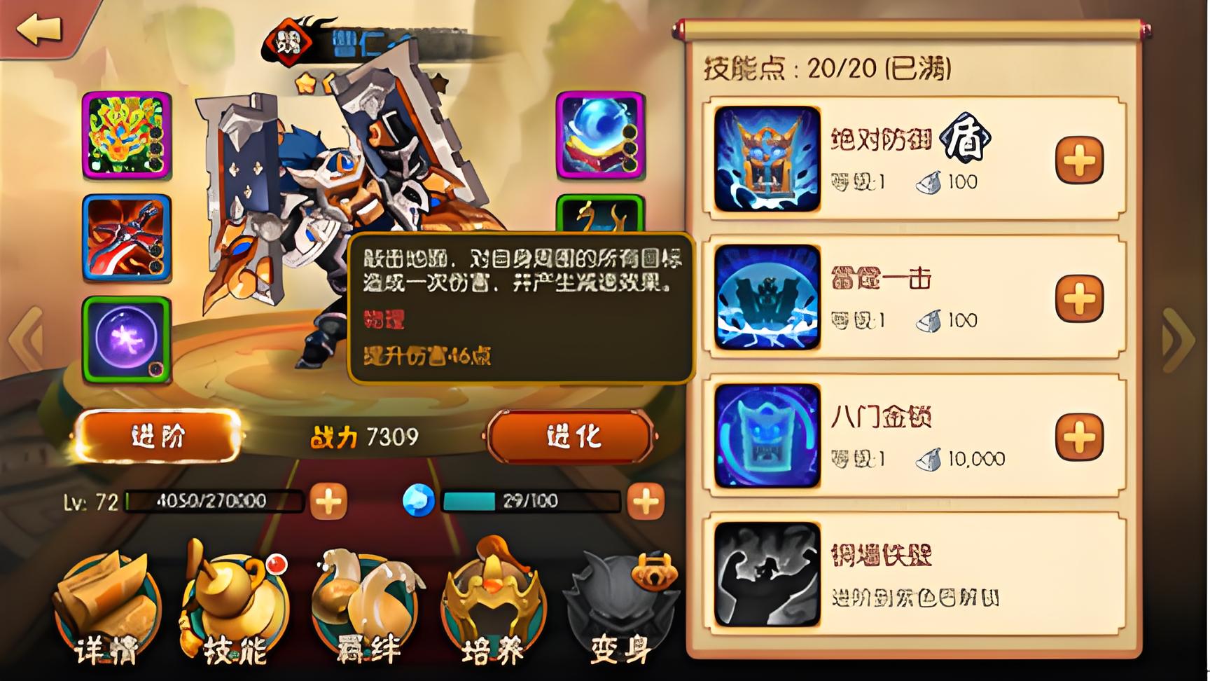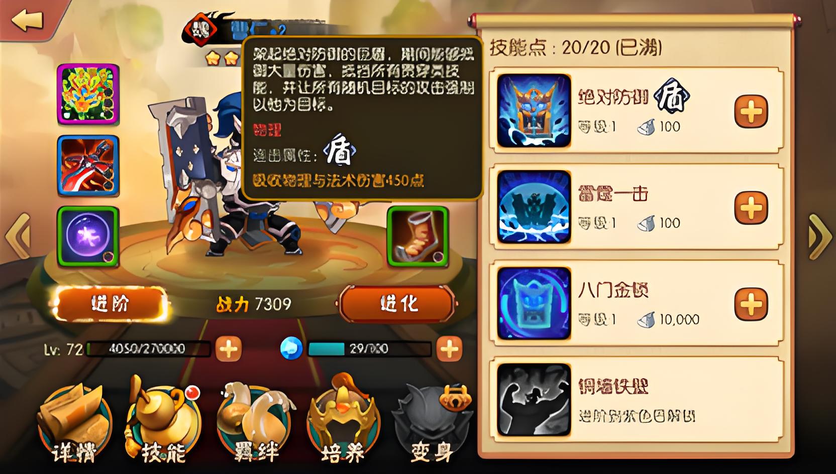 2、大技能絕對防御架巨盾抵御傷害,抵擋貫穿技能,強制隨機目標攻擊自己,1級吸收物理與法術傷害450點。