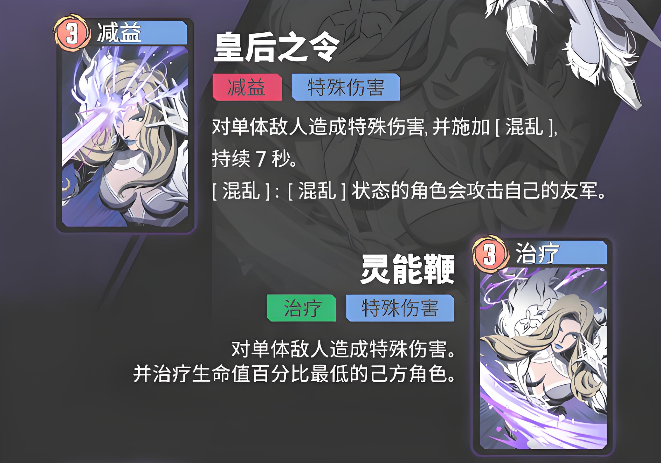 1、主動技能皇后之令可對單體敵人造成特殊傷害,施加持續7秒的混亂狀態,處于混亂狀態的角色會攻擊自身友軍,該技能屬于減益類技能。