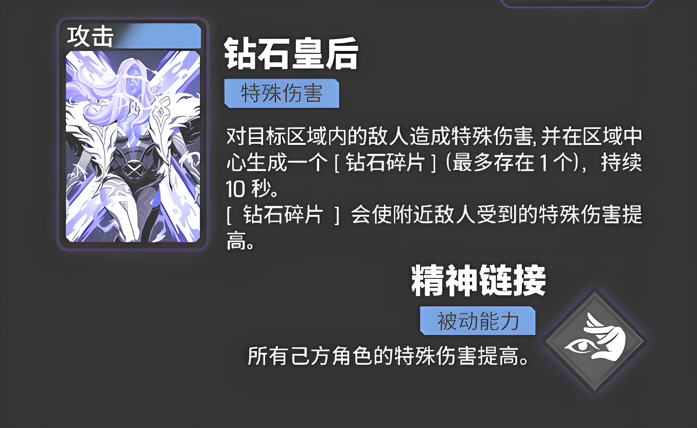 3、主動技能鉆石皇后對目標區域內敵人造成特殊傷害,區域中心生成持續10秒的鉆石碎片,可提高附近敵人受到的特殊傷害。