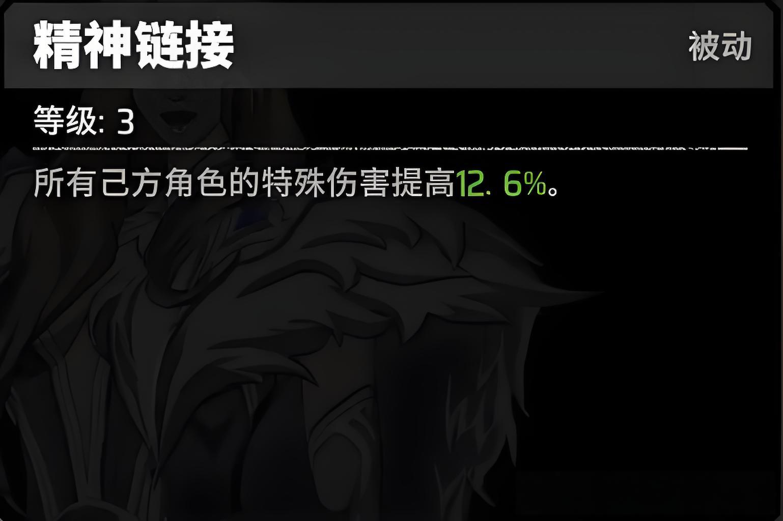 4、被動技能精神鏈接能讓所有己方角色特殊傷害提高,適用于所有傷害類型為特殊傷害的角色,幫助隊伍整體輸出提升。