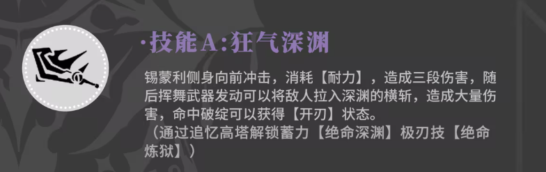 2、技能一巨人斬附帶狂氣深淵效果,錫蒙利側身向前沖擊消耗耐力,造成3段連續傷害后揮舞武器生成深淵,將敵人投入后橫斬造成大額輸出。