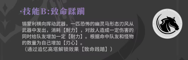 3、技能二致命蹂躪橫向揮動武器,召喚靈體幽靈馬駒從刃鋒出現,消耗耐力對敵人造成傷害的同時為隊友增加耐力,命中敵人還能給自己加韌性。