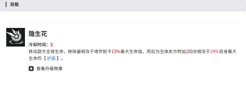 2、核心技能隱生花冷卻三回合,持續扣目標相當于自身20%最大生命值的血量,同時為全體友方加等量護盾,攻防一體適配團戰需求。
