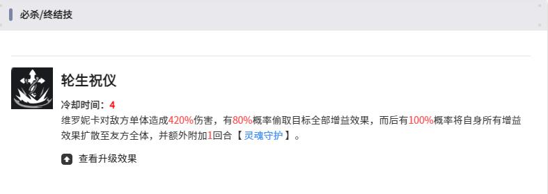 3、終極技能轉生祝儀冷卻四回合,對單一敵人造成420%攻擊力爆發傷害,抽取目標所有增益轉至我方全體,還觸發靈魂守護為隊友回血。