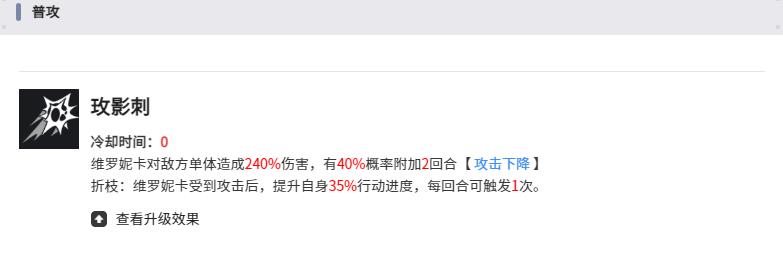 1、普通攻擊玫瑰刺對單個敵人造成物理傷害,有概率附加兩回合攻擊下降效果,受擊后觸發被動提升移動速度,每回合可激活一次增強機動性。