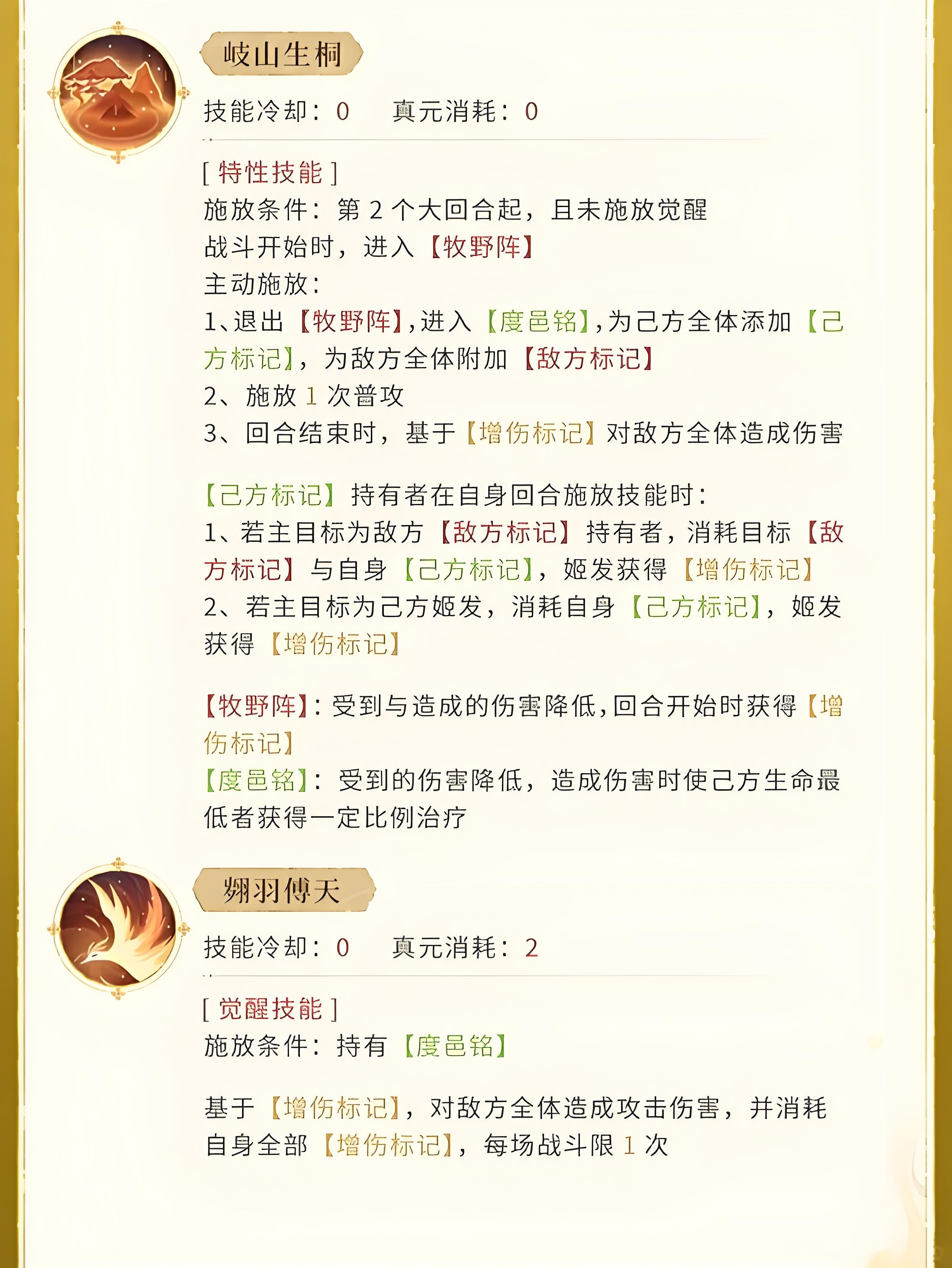 1、特性技能岐山生桐無冷卻無真元消耗,主動施放后轉度邑銘,為己方全體加己方標記、敵方全體加敵方標記。