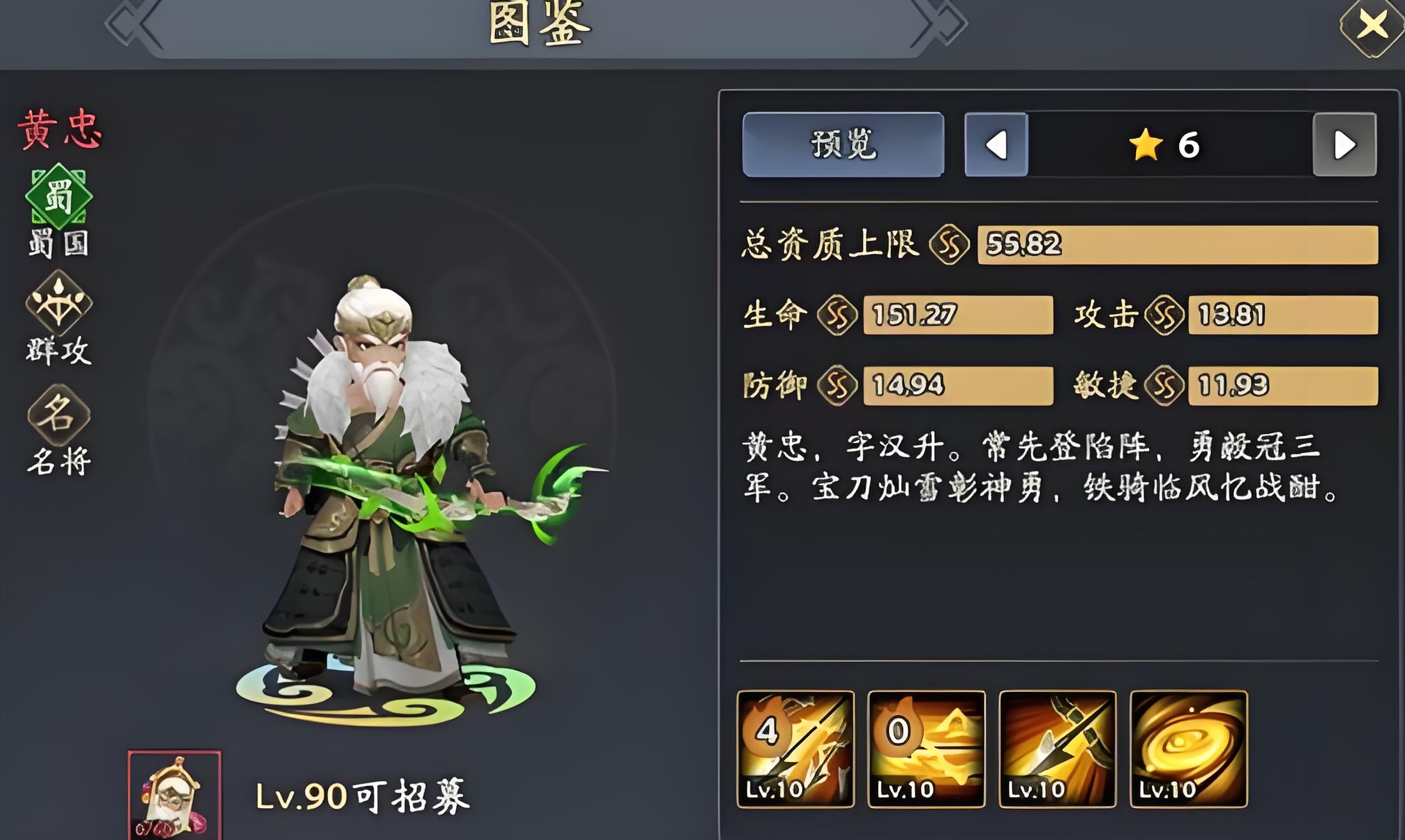 1、角色是名將品質遠程輸出武將,總資質上限達頂尖水平,生命防御攻擊敏捷四項屬性均達S或SS級,等級90可招募前期推圖清兵表現突出。
