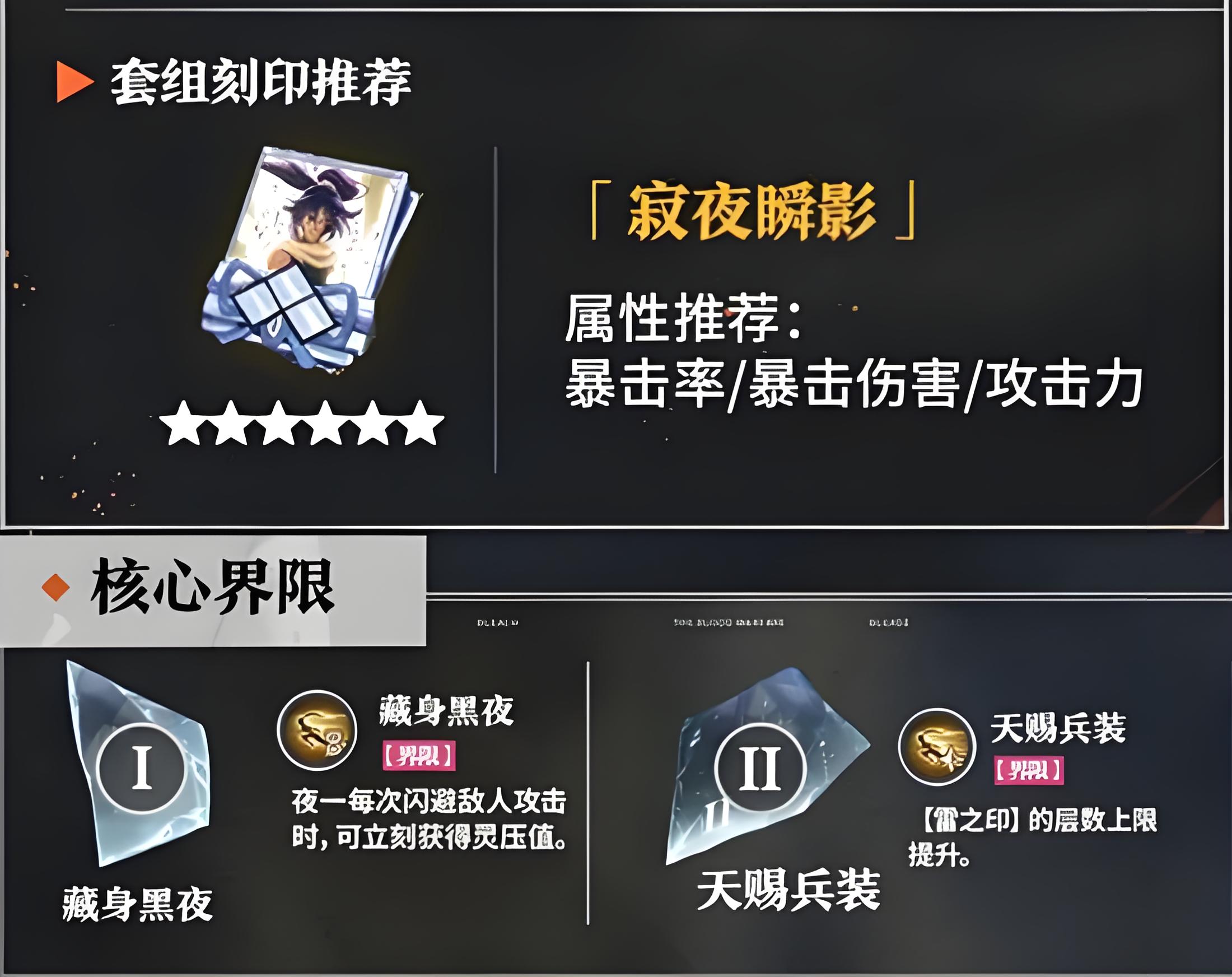 3、套裝刻印推薦寂夜瞬影,激活后顯著提升暴擊傷害與暴擊觸發概率,貼合夜一依賴高頻攻擊與暴擊疊加的輸出方式,短時間打高額爆發。