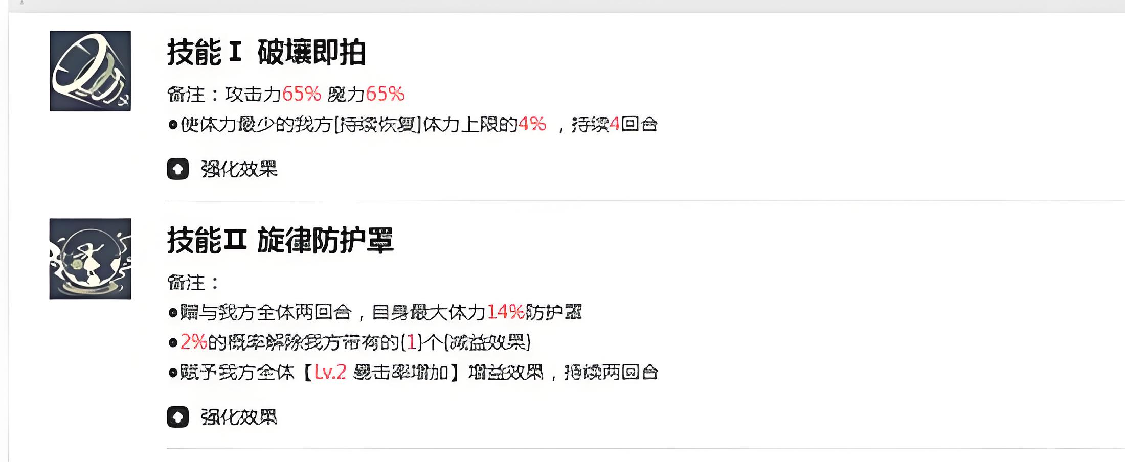 3、旋律防護罩是招牌技能為全體隊友施加持續兩回合的護盾,護盾值基于自身最大體力14%還能提升全隊暴擊率兼顧保護與輸出增強。
