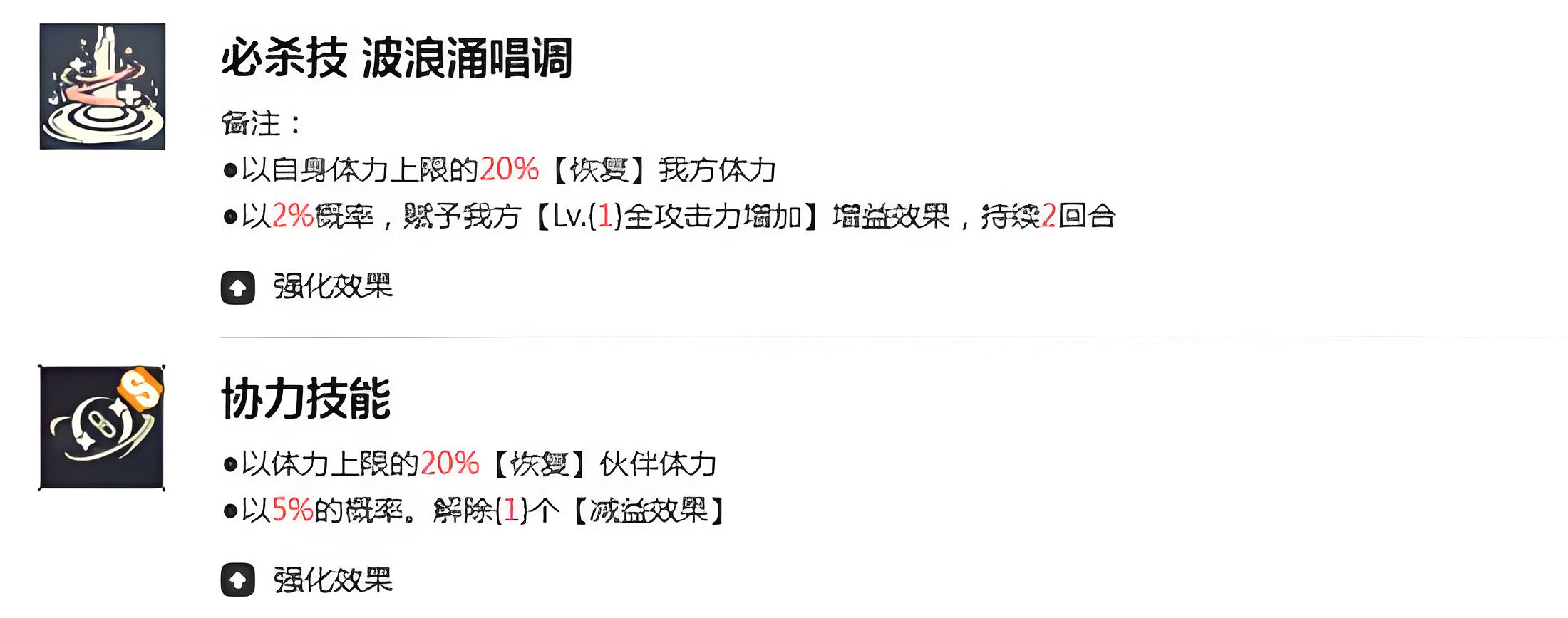 4、波浪涌唱調作為必殺技以自身最大體力20%為基礎為全體隊友回血,附帶2%概率觸發全體攻擊力提升配合專屬被動放大效果。