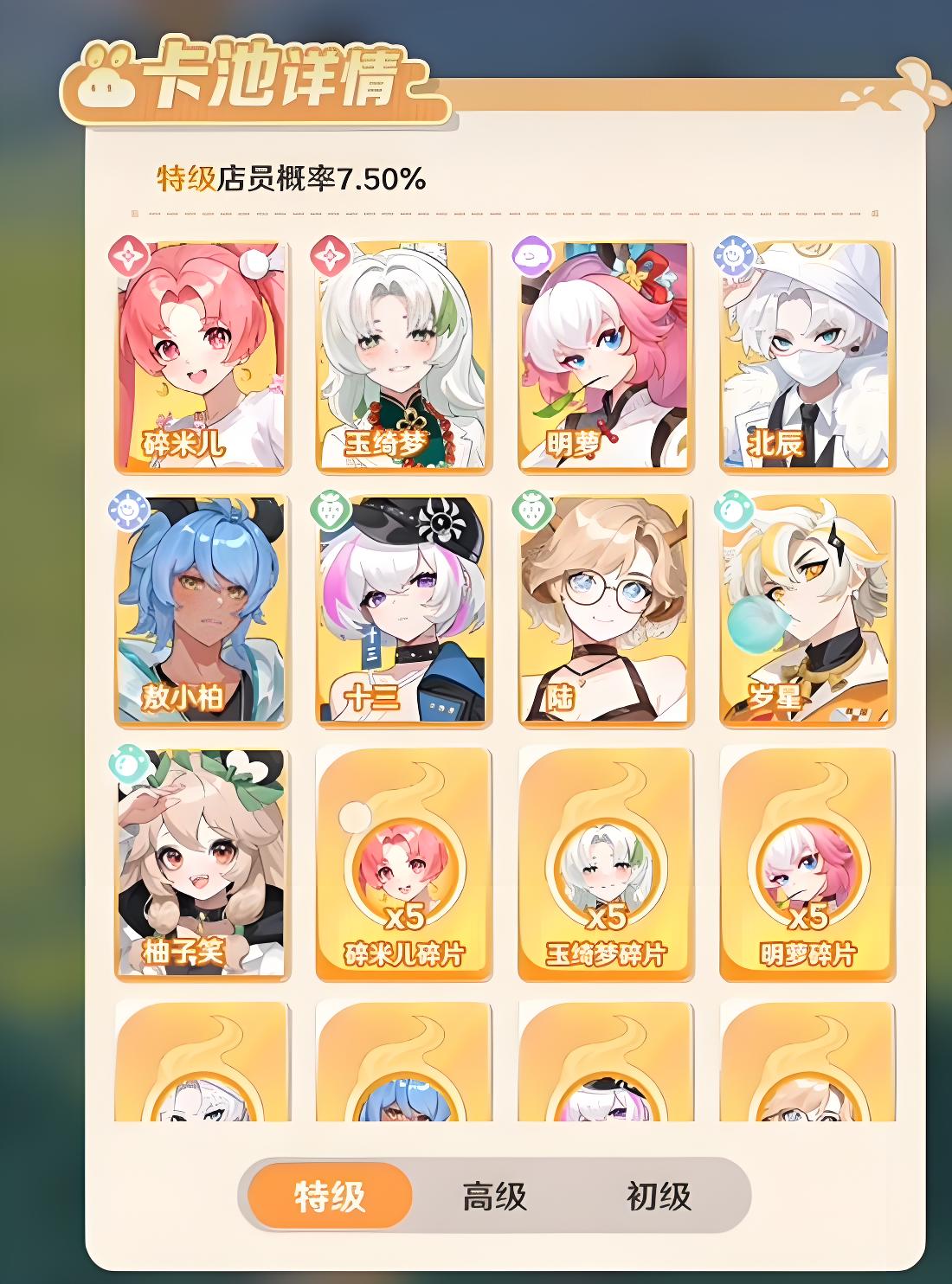 1、店員需通過抽卡獲取碎片,集齊碎片合成完整角色,每個店員有不同專長,有的擅長接待顧客有的擅長加快菜品制作,需根據專長規劃培養。