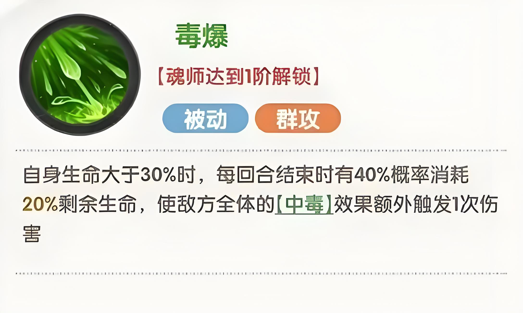 5、他主動技能劇毒領域對敵方全體施多層毒性,每層造成不低于目標最大生命值2%傷害,被動毒暴血線超30%附加全體重度毒傷。