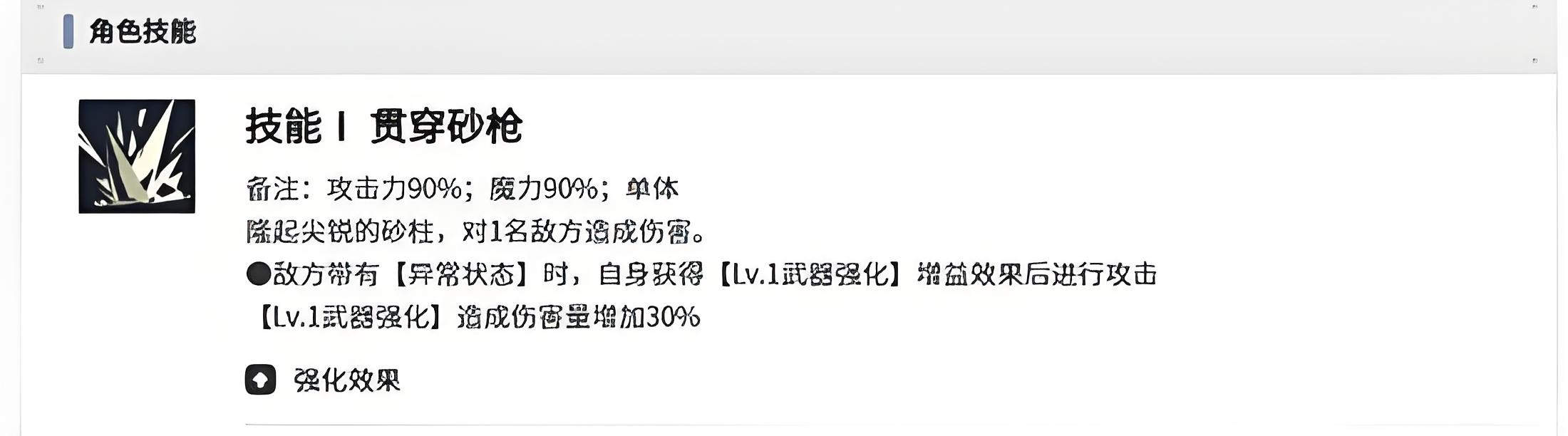 1、核心技能貫穿砂槍是單體輸出技能,基礎攻擊力和魔力值加成均為90%,召喚尖銳沙柱造成傷害,敵方異常時獲武器強化提后續30%攻擊傷害。