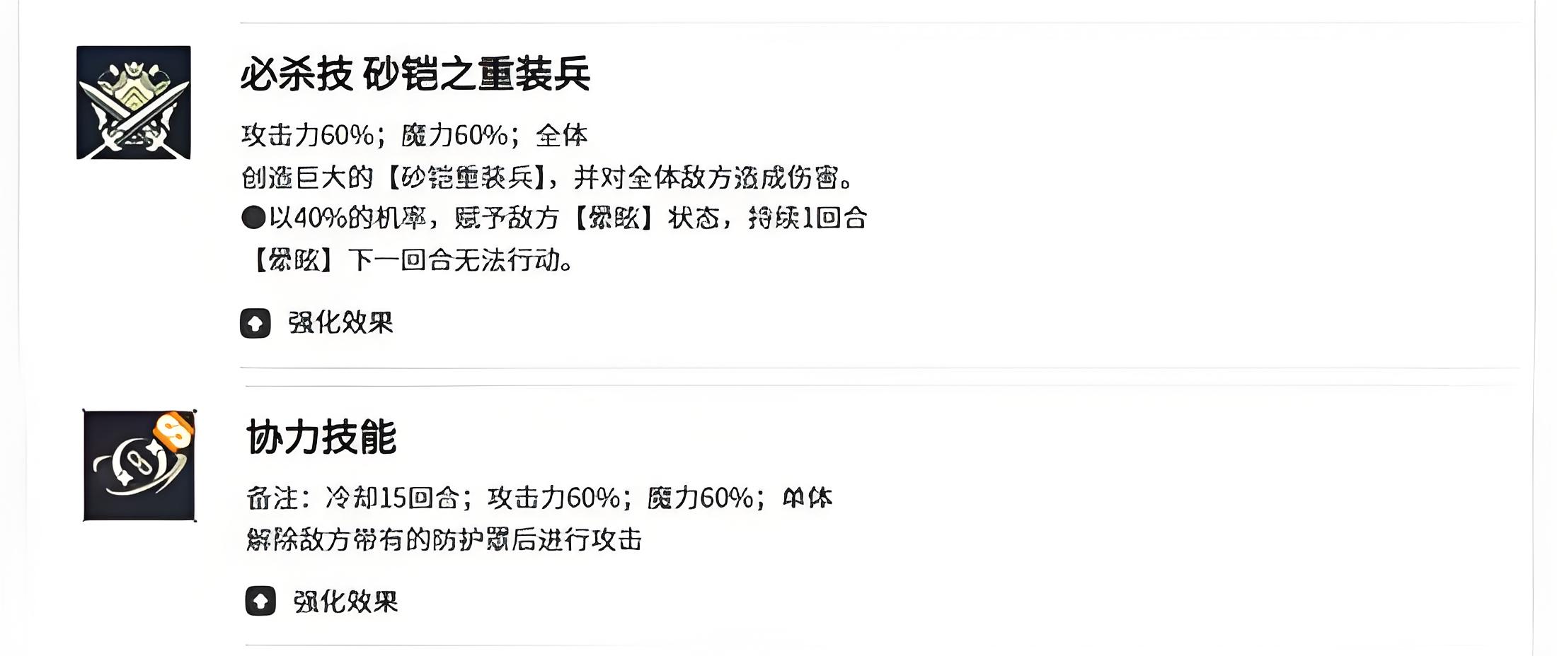3、必殺技砂鎧之重裝兵攻魔加成60%,覆蓋全體敵人召喚重裝兵造范圍傷害,40%概率附暈眩,復數敵人場景清理小怪打亂陣型更優。