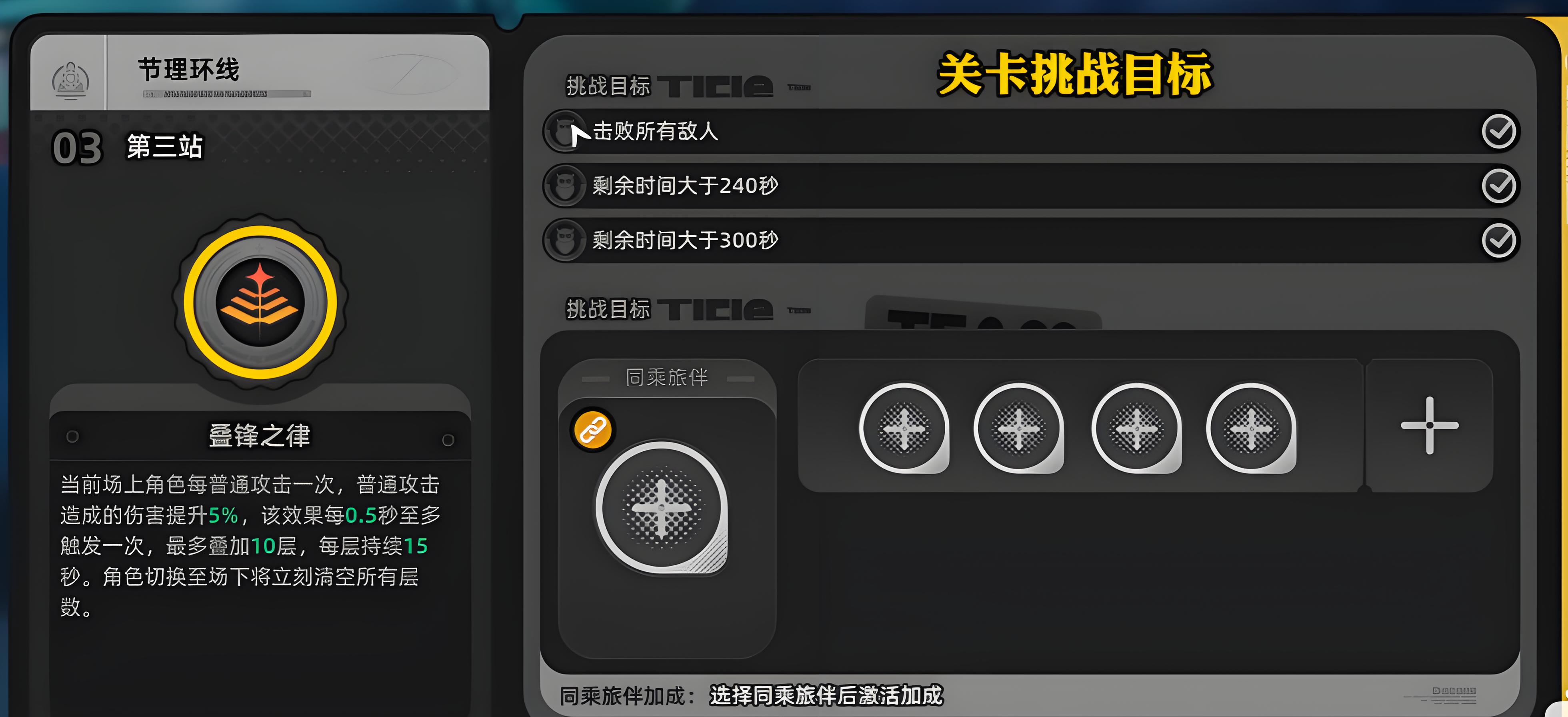 3、同乘旅伴功能可選一名加入隊伍提供額外增益,其余四位置配置主戰隊伍,按關卡需求和個人戰斗風格靈活調整陣容。