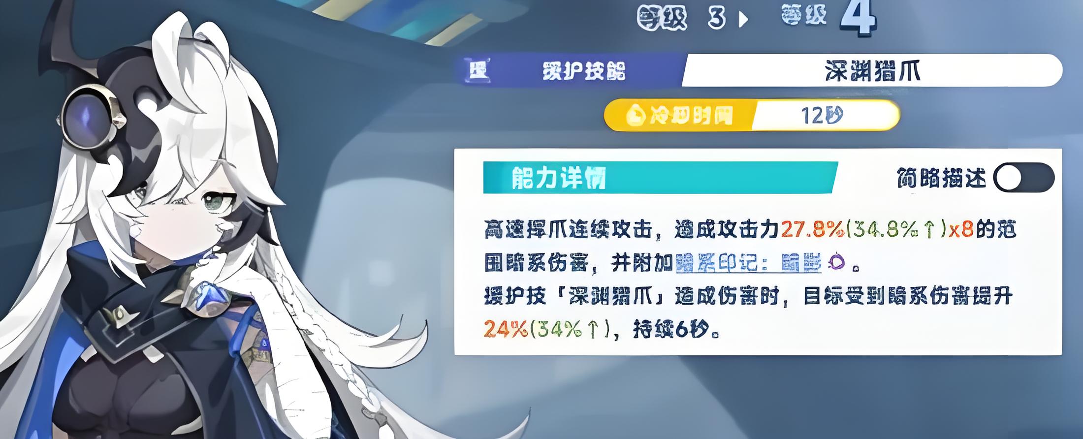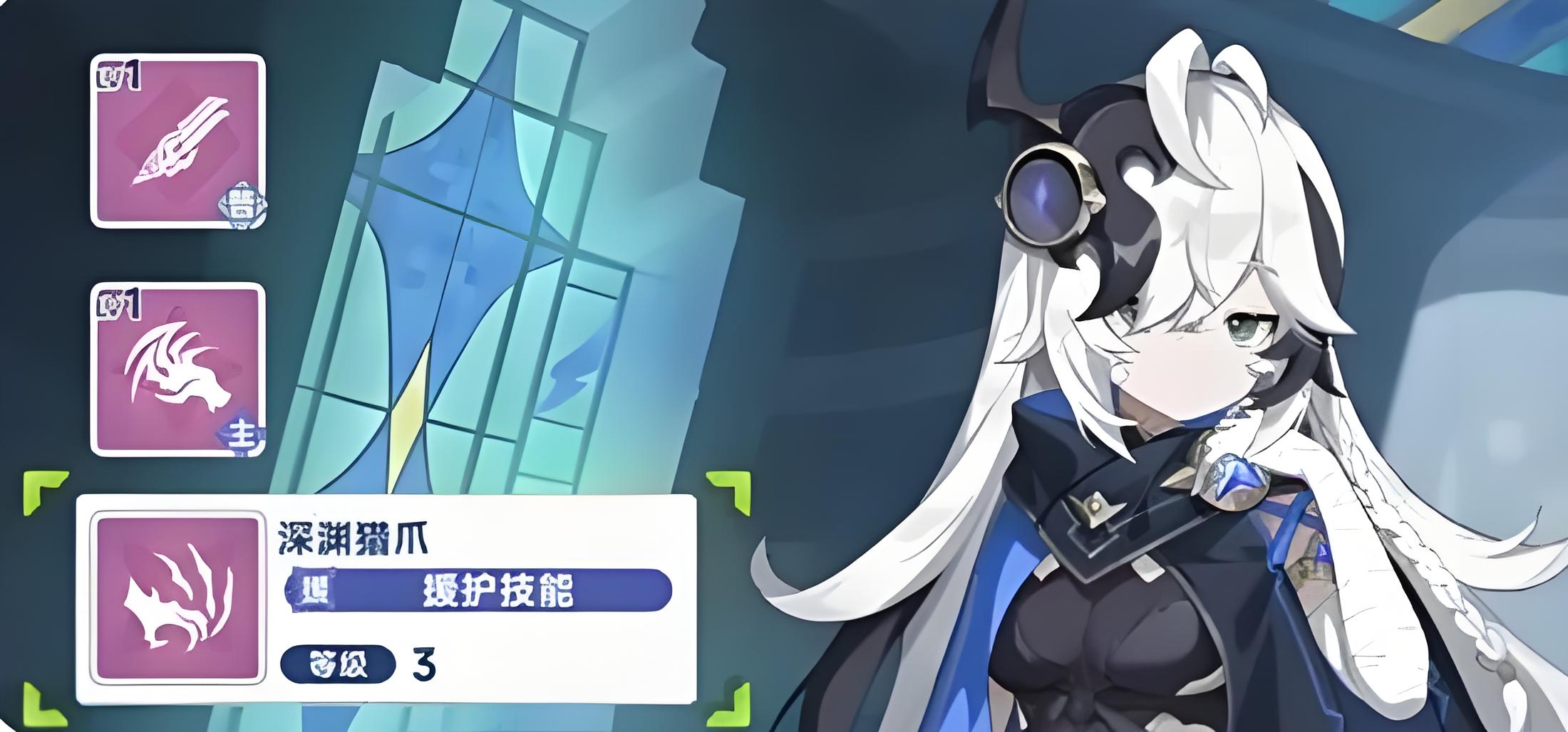 2、深淵獵爪是關鍵技能,攻擊時造基礎傷害,附加暗屬性易傷,還能觸發殘影印記,最多疊三層,每層提4點6%攻擊,疊滿達12%。