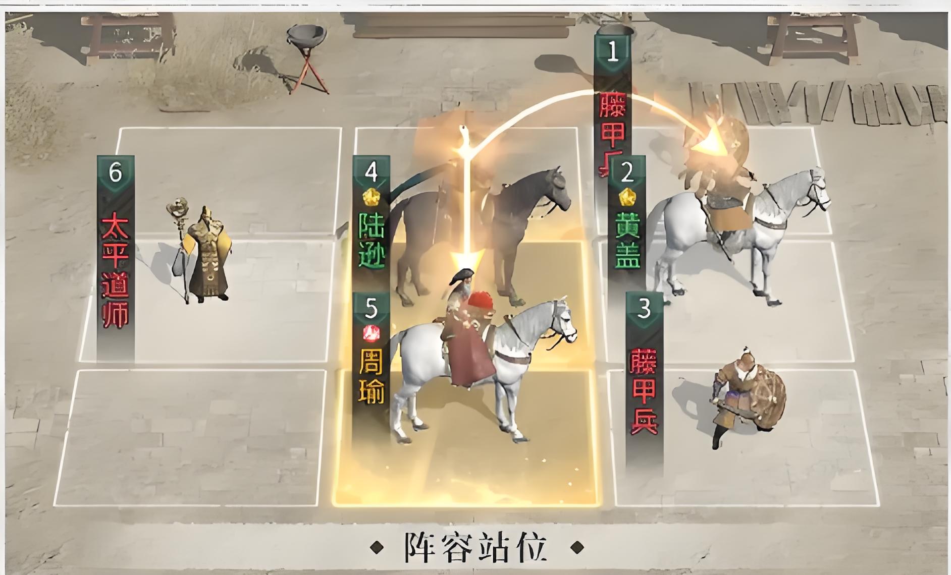 3、站位設計需讓陸遜踩到周瑜和黃蓋的追擊格,通過多次觸發天賦不意流火,最大化隊伍爆發能力契合快節奏對戰核心需求。