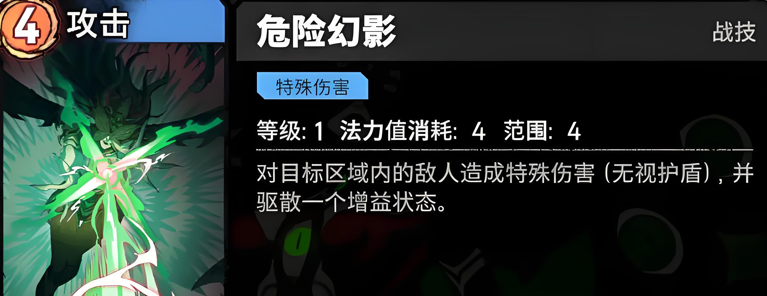 2、戰技二危險幻影耗法力有范圍,無視護盾傷驅增益,兼具輸出輔助能力,適合清場打高護盾目標。