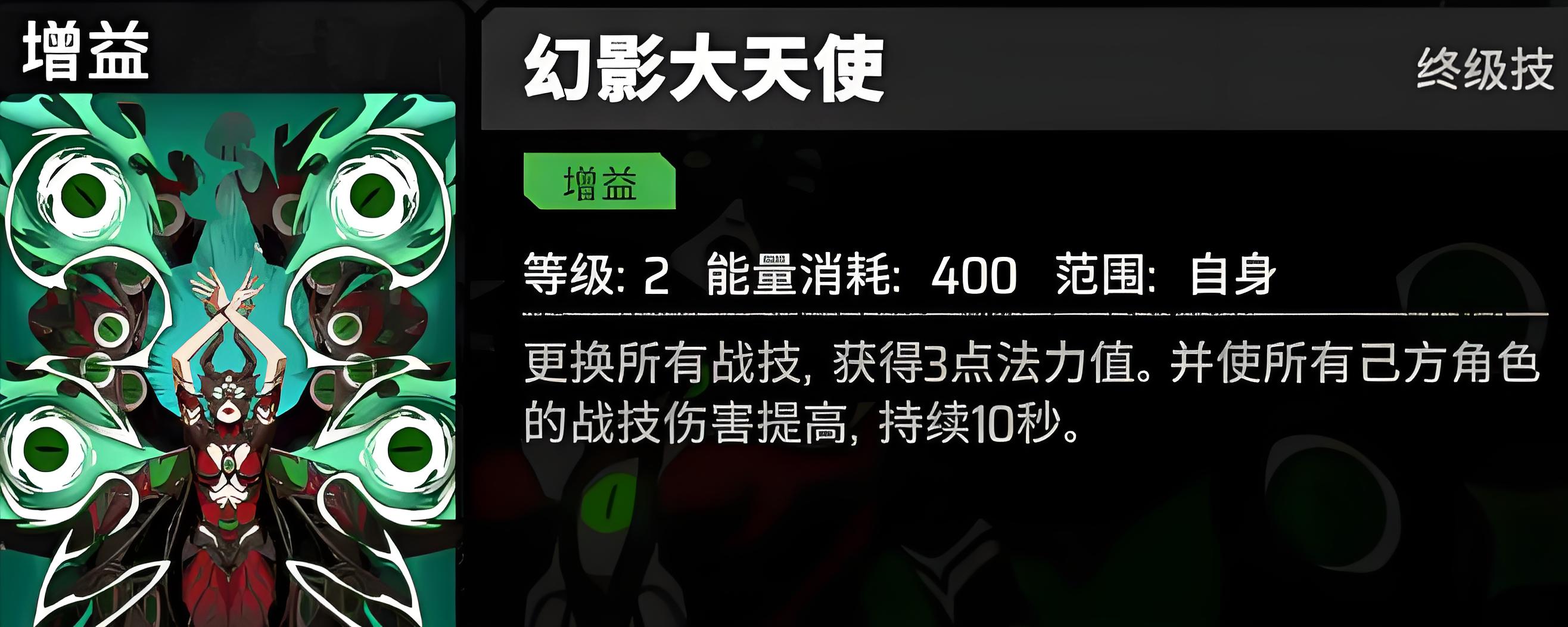 3、大招幻影大天使換所有戰技,持續一段時間提隊友,戰技傷害集火前用,增強團隊爆發輸出效果。