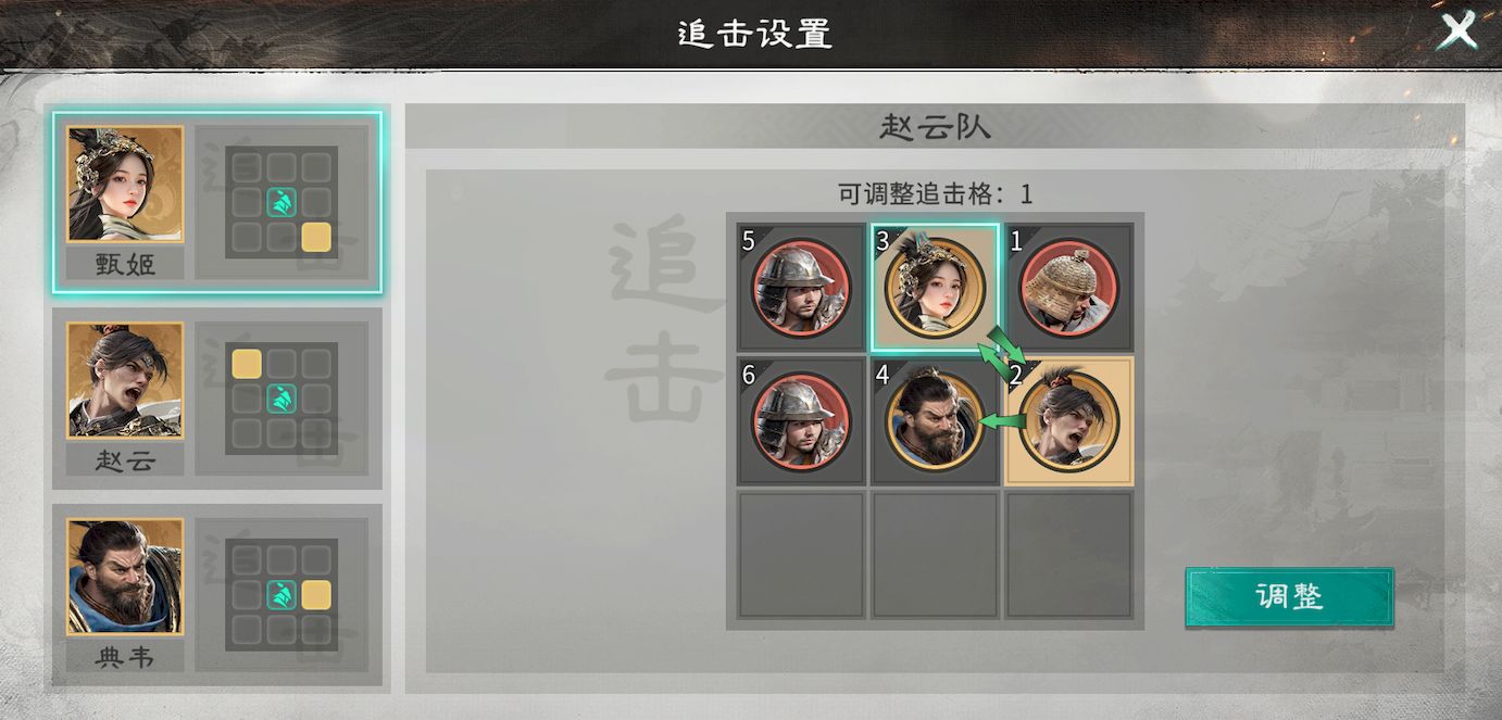 5、趙云主動調整追擊格至右上位置,讓甄姬順利進入其追擊格,穩定觸發追擊技能形成攻防協同體系。