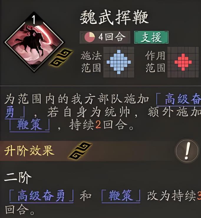 2、曹操技能選短歌行或魏武揮鞭,可增攻擊力減30%反擊傷害,走統帥路線,解鎖鞭策效果不浪費資源。