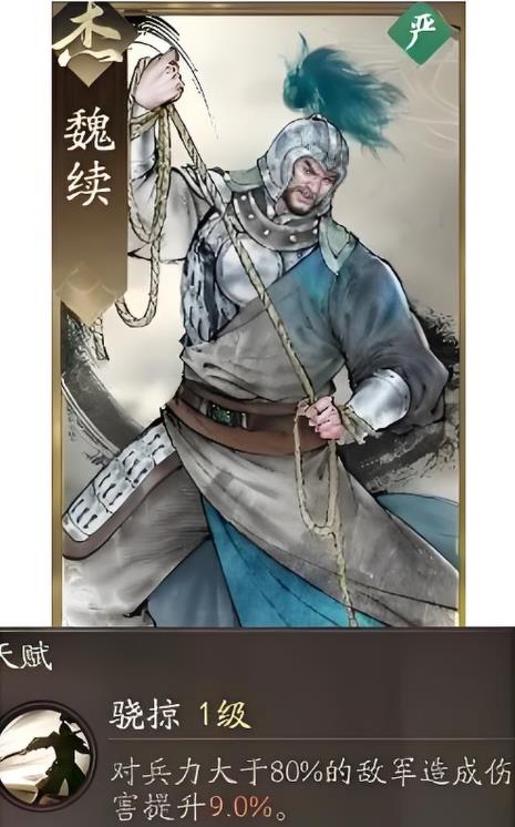 3、魏續走步兵路線放前排承傷,兼具副輸出,技能帶猛擊或破甲增傷,同時保障曹操輸出環境提升陣容坦度。
