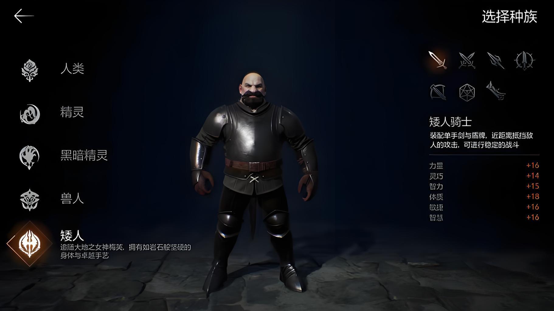 1、種族職業選擇需先在五大種族中選矮人,再選擇進階為矮人騎士,該職業可裝備單手劍和盾牌,擅長近距離抵擋敵人攻擊。