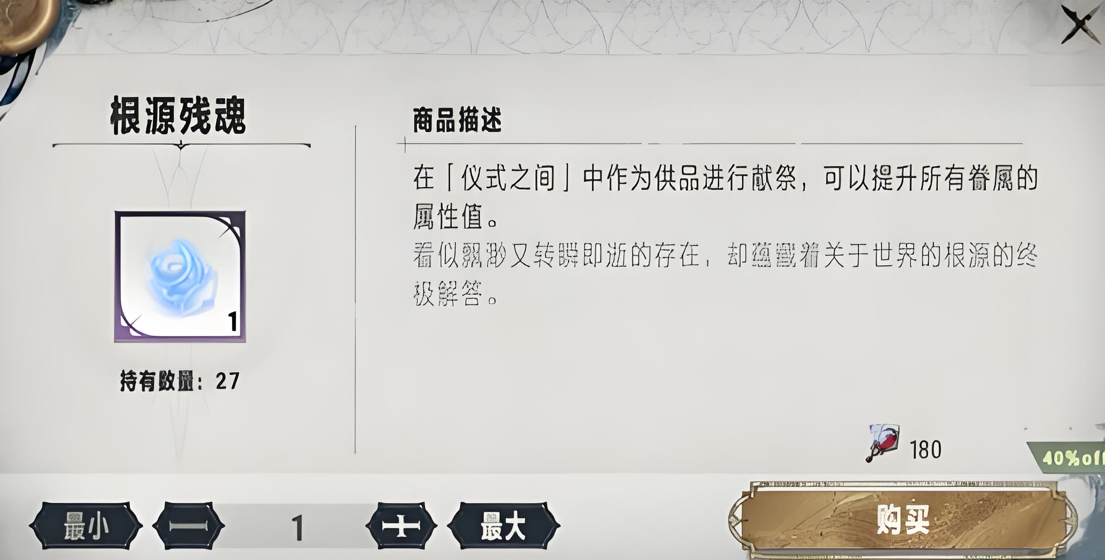 2、兌換根源殘魂材料,其能提升角色基礎屬性,補足機制優秀但初始屬性低角色的短板,用代幣直接購買,提前儲備助力角色快速成型。