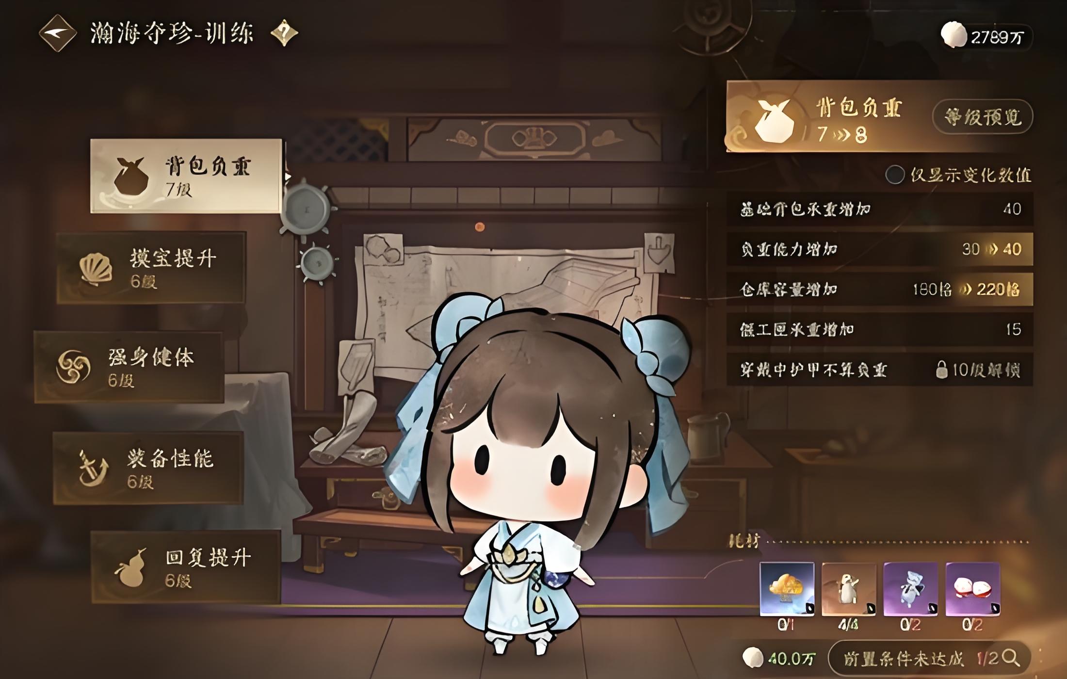 2、背包攜帶檀香包裹能增加120格子性價比突出,需注意提升背包負重等級,穿戴中護甲不計入負重,倉庫與偃工匣承重隨等級同步提升。