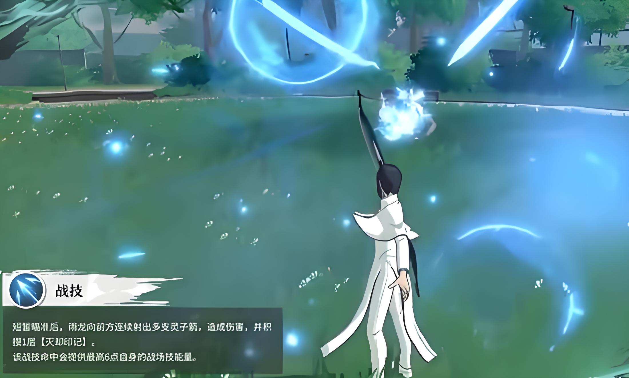 2、戰技靈子箭連射可向前方射出多支靈子箭,造成范圍傷害并疊加滅卻印記,最高提供六點戰場技能量適配連招銜接。