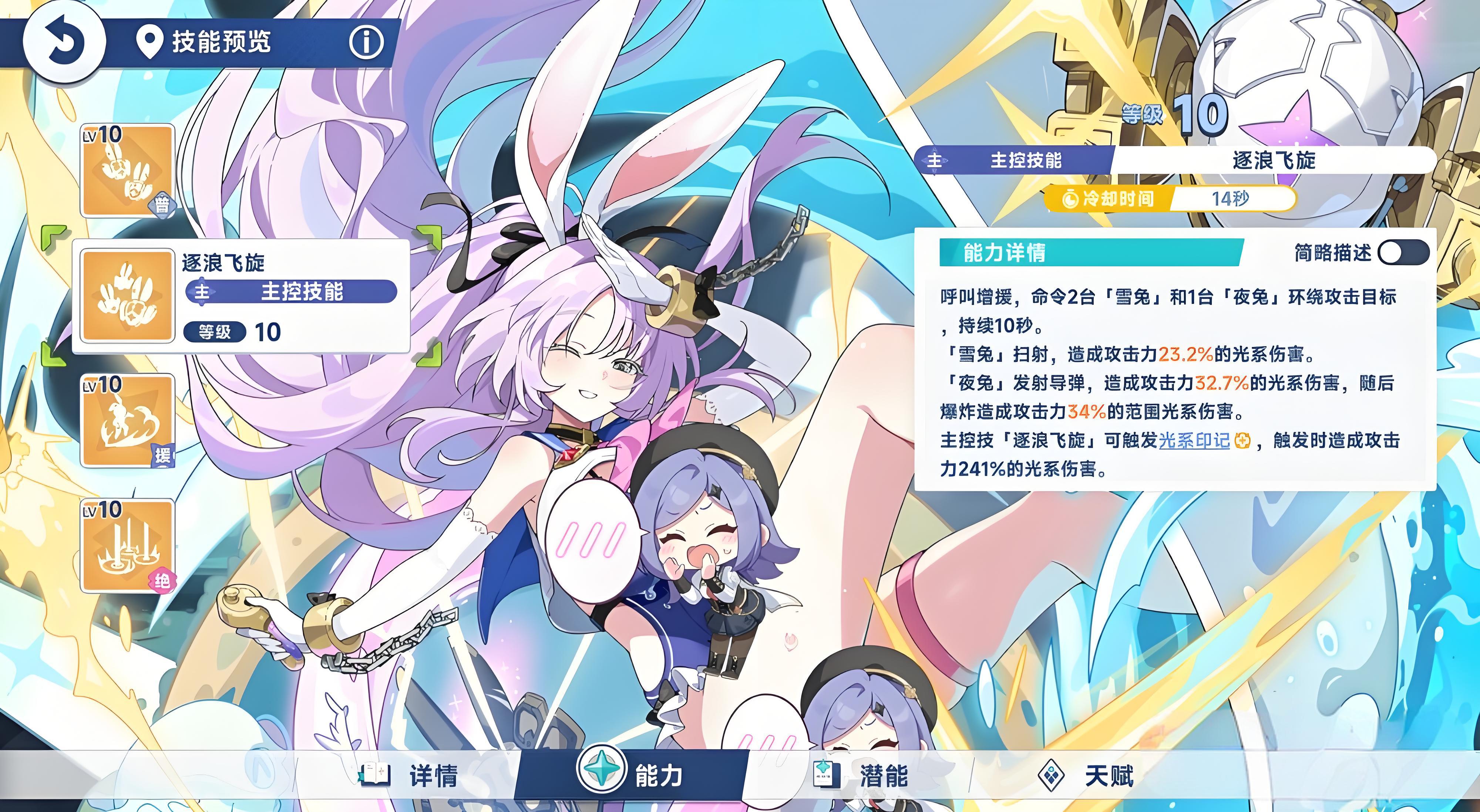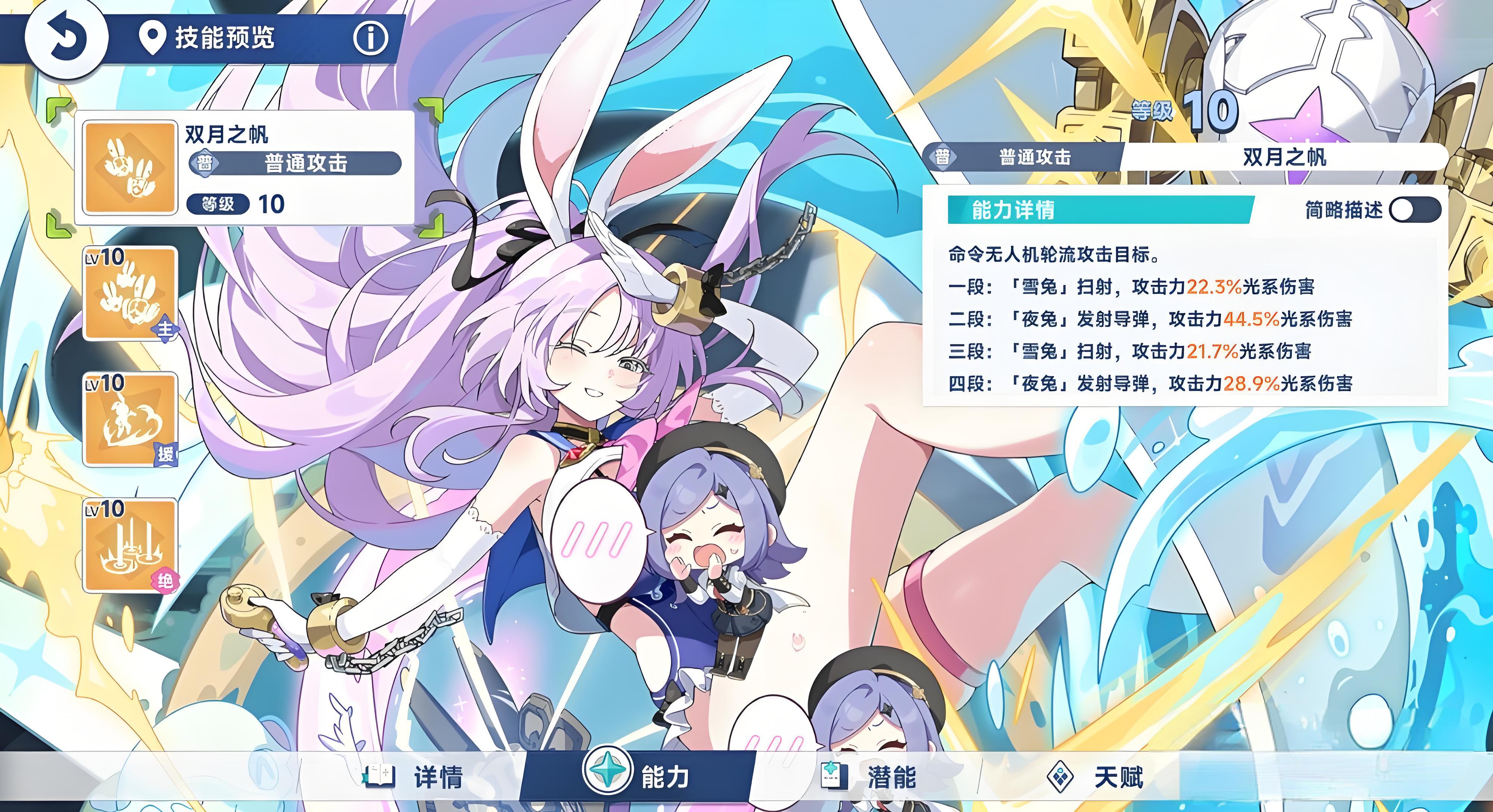 1、普攻為四段式遠程打擊,召喚雪兔無人機掃射和夜兔無人機發射導彈,復合型攻擊提升輸出節奏,為后續技能聯動鋪墊。