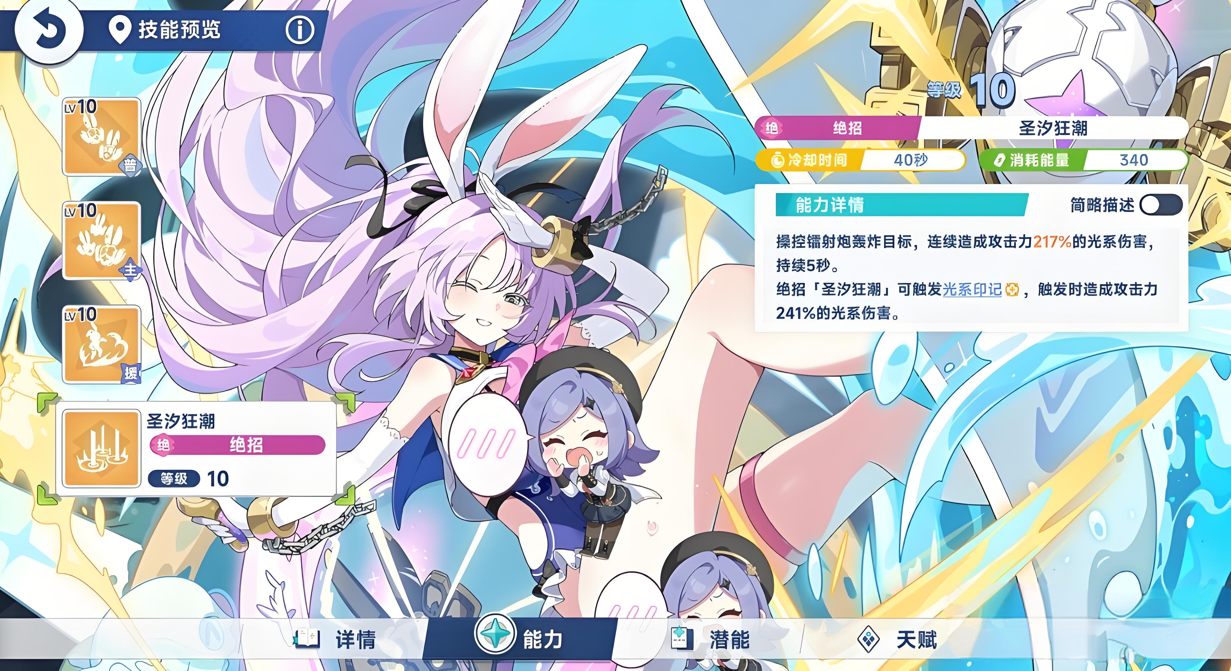 3、絕招圣汐狂潮持續五秒鐳射炮轟擊,每次射擊均可引爆光系印記,連鎖傷害可觀,冷卻四十秒需消耗對應能量。