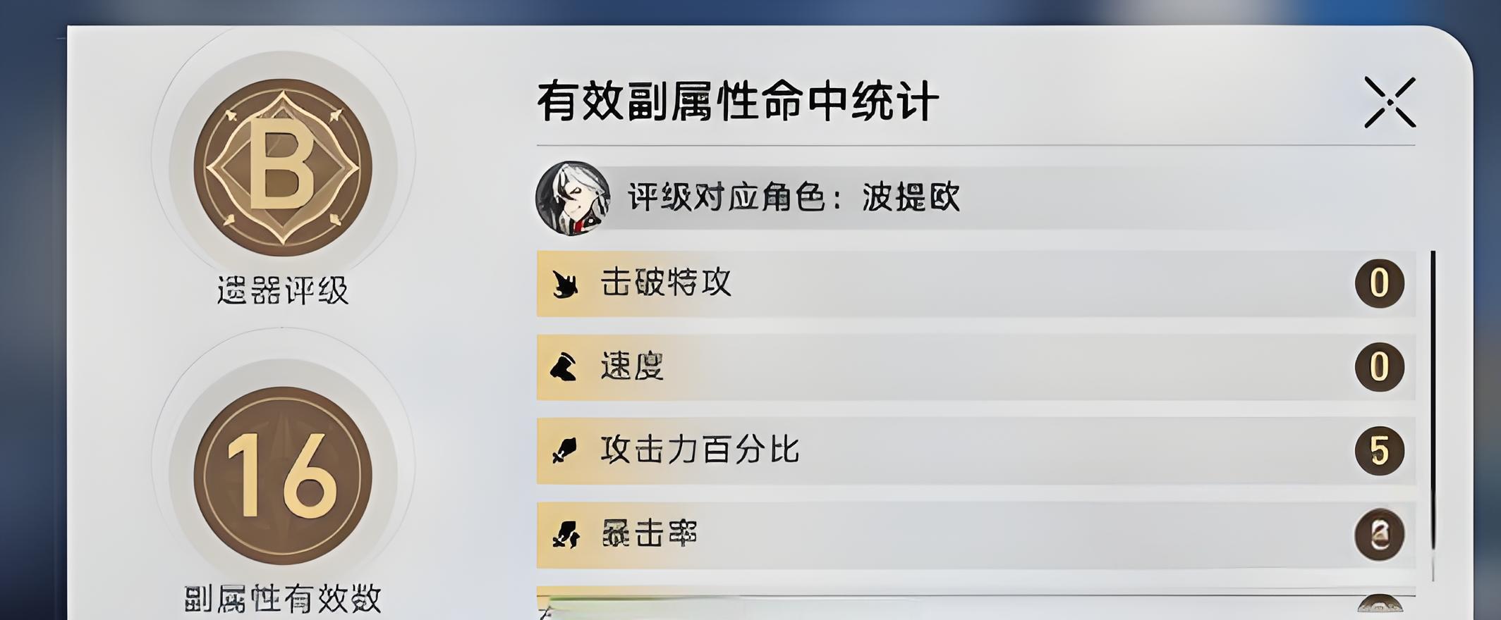 4、遺器評級由副屬性有效數決定,有效副屬性命中數量越多評級越高,高品質遺器能為角色帶來更顯著的戰力提升。