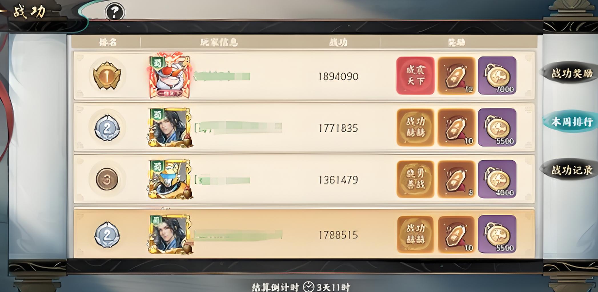 5、每周戰功前列者獲稀有稱號及召喚令,國庫每四天分紅一次,官職越高分紅比例越大單次收益可觀。