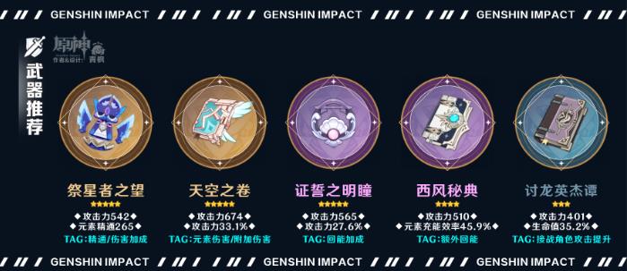 3、武器優先選祭星者之望或天空之卷,備選證誓之明瞳西風秘典,過渡可選討龍英杰譚提升隊伍輸出。