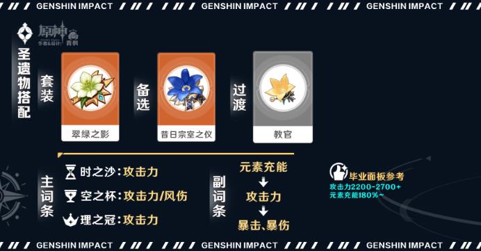 4、圣遺物主選翠綠之影套裝,備選昔日宗室之儀,過渡用教官套,詞條優先攻擊力風傷充能暴擊暴傷。