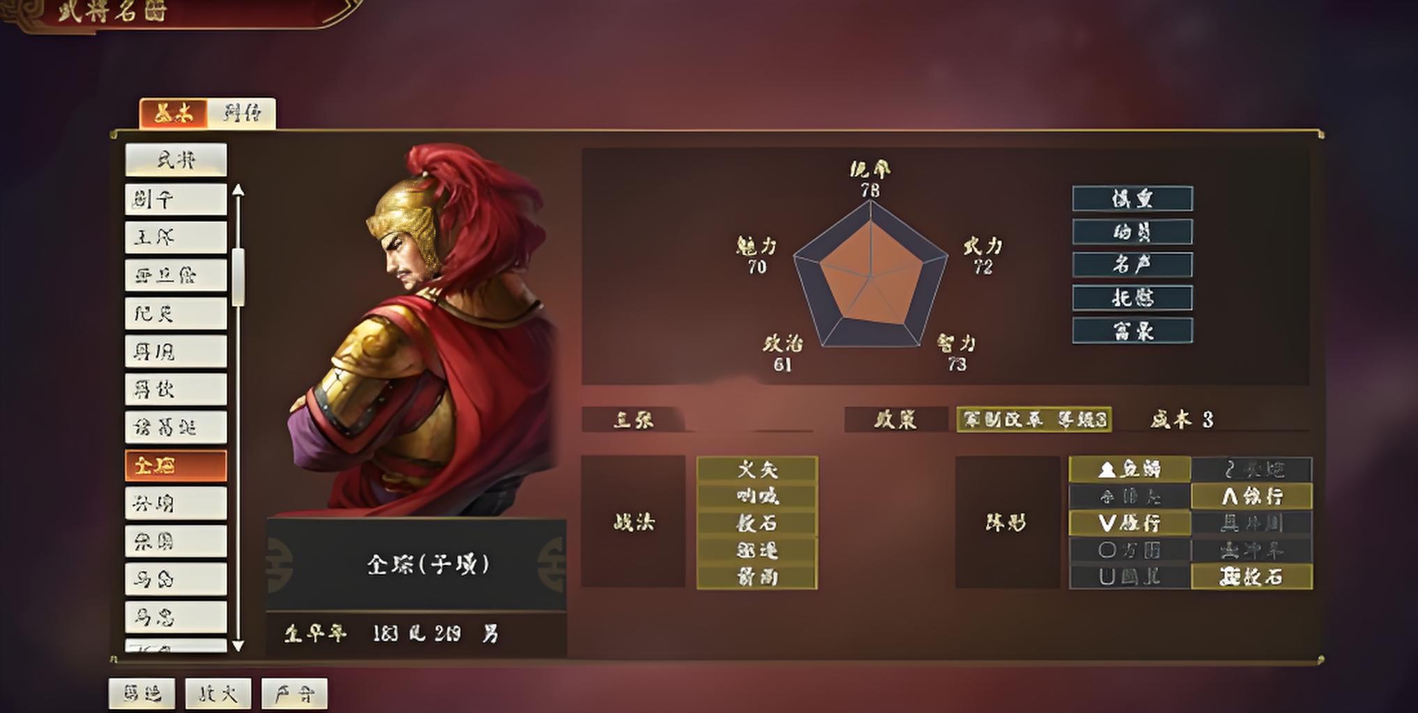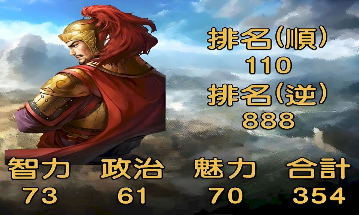 1、屬性分布十分均衡,武力七十二統帥七十八智力七十五,可兼顧前線作戰與部隊指揮,政治六十一魅力七十雖不突出,仍能支持內政。