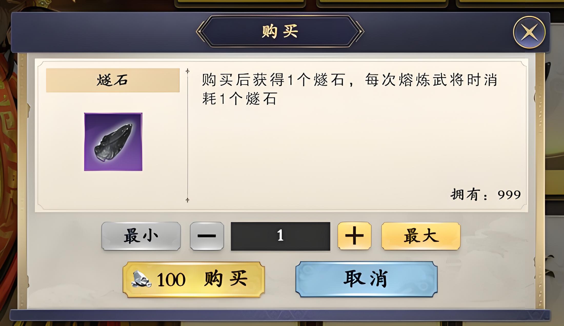 4、操作消耗需每次熔煉投入1顆燧石和100銀兩,燧石可通過游戲商店購買,重置熔煉同樣需要消耗燧石。