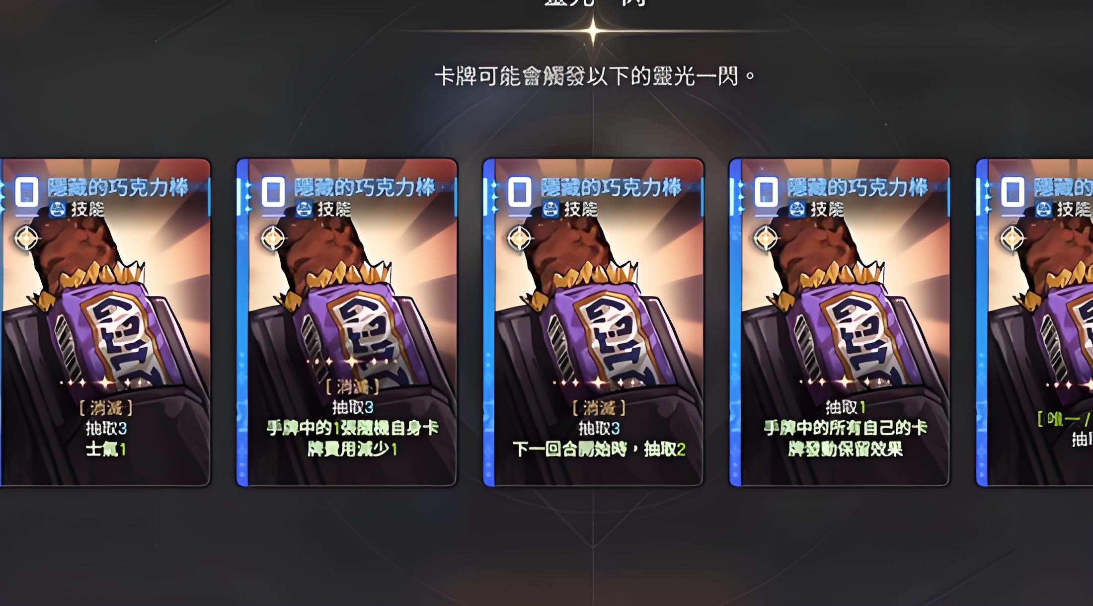 3、隱藏的巧克力棒無行動點消耗屬消滅類效果,使用后抽取3張手牌,增強資源調度能力緩解手牌緊張問題不影響主技能節奏。