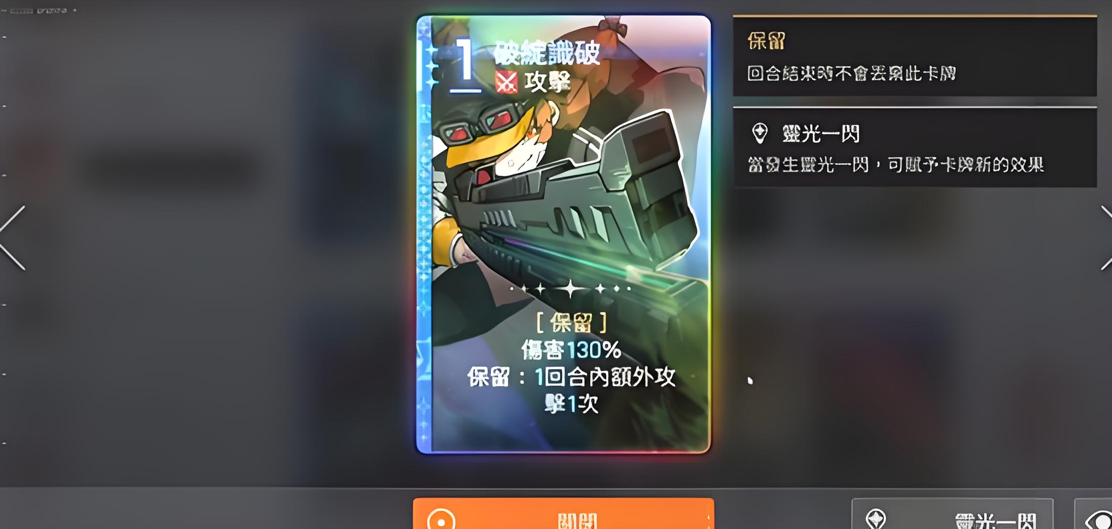 1、破綻識破消耗1點行動點基礎傷害120%攻擊力,附帶保留效果回合結束觸發額外攻擊,助力銜接高費技能構建爆發鏈條。