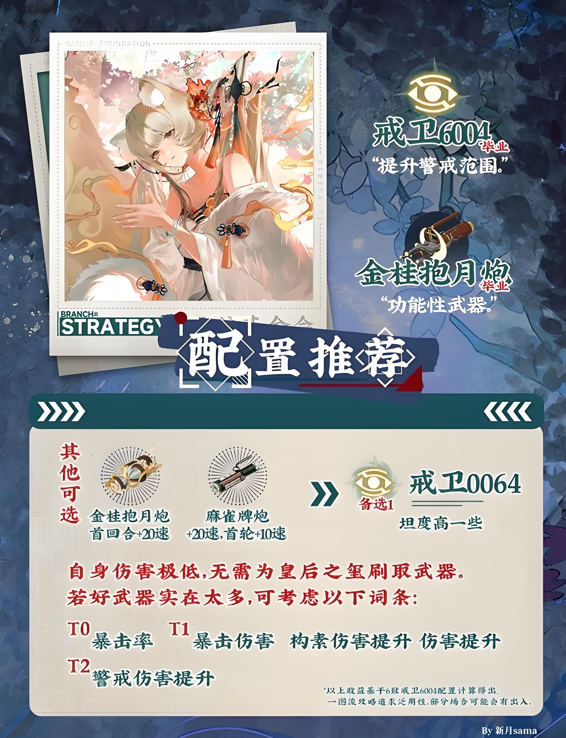 3、武器首選金桂抱月炮首回合加20速,備選麻雀牌炮,裝備推薦戒衛6004,無需專門刷取武器可按需選擇詞條。