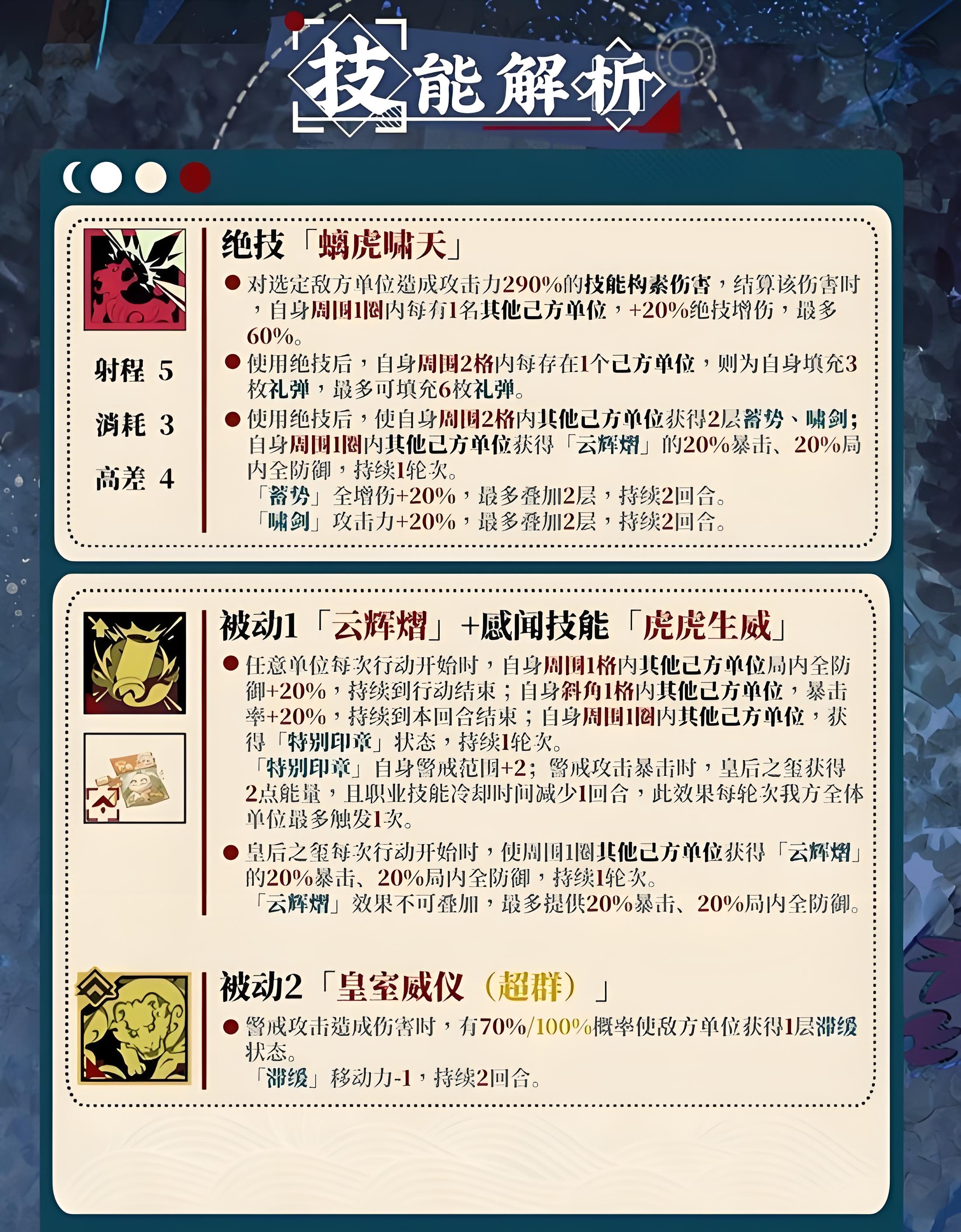 1、煥彰后基礎速度165為高速水平,是唯一群體蓄勢嘯劍拐,提供20%暴擊率20%局內全防御,還能擴大戰略角色警戒范圍。