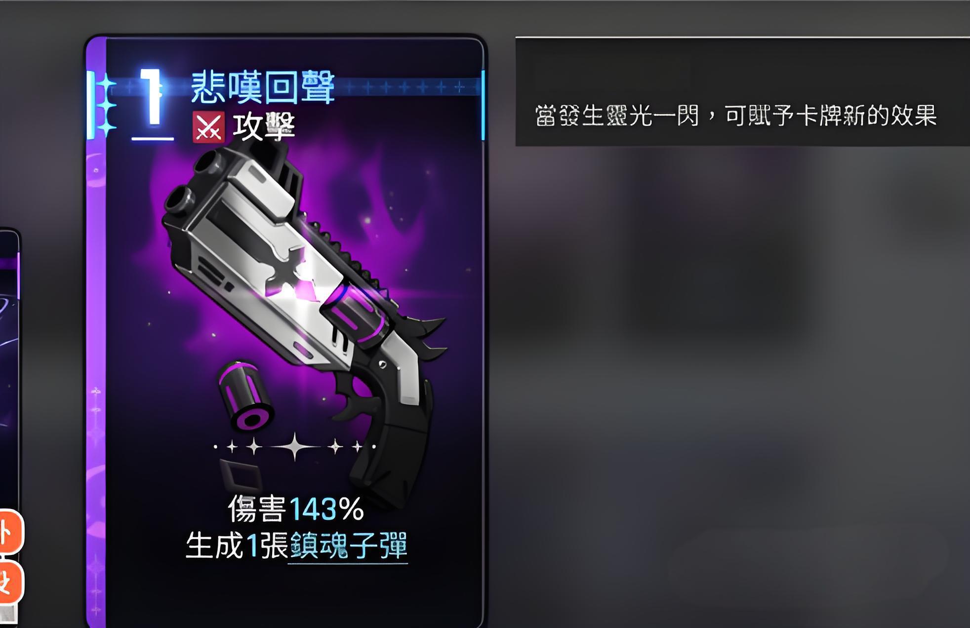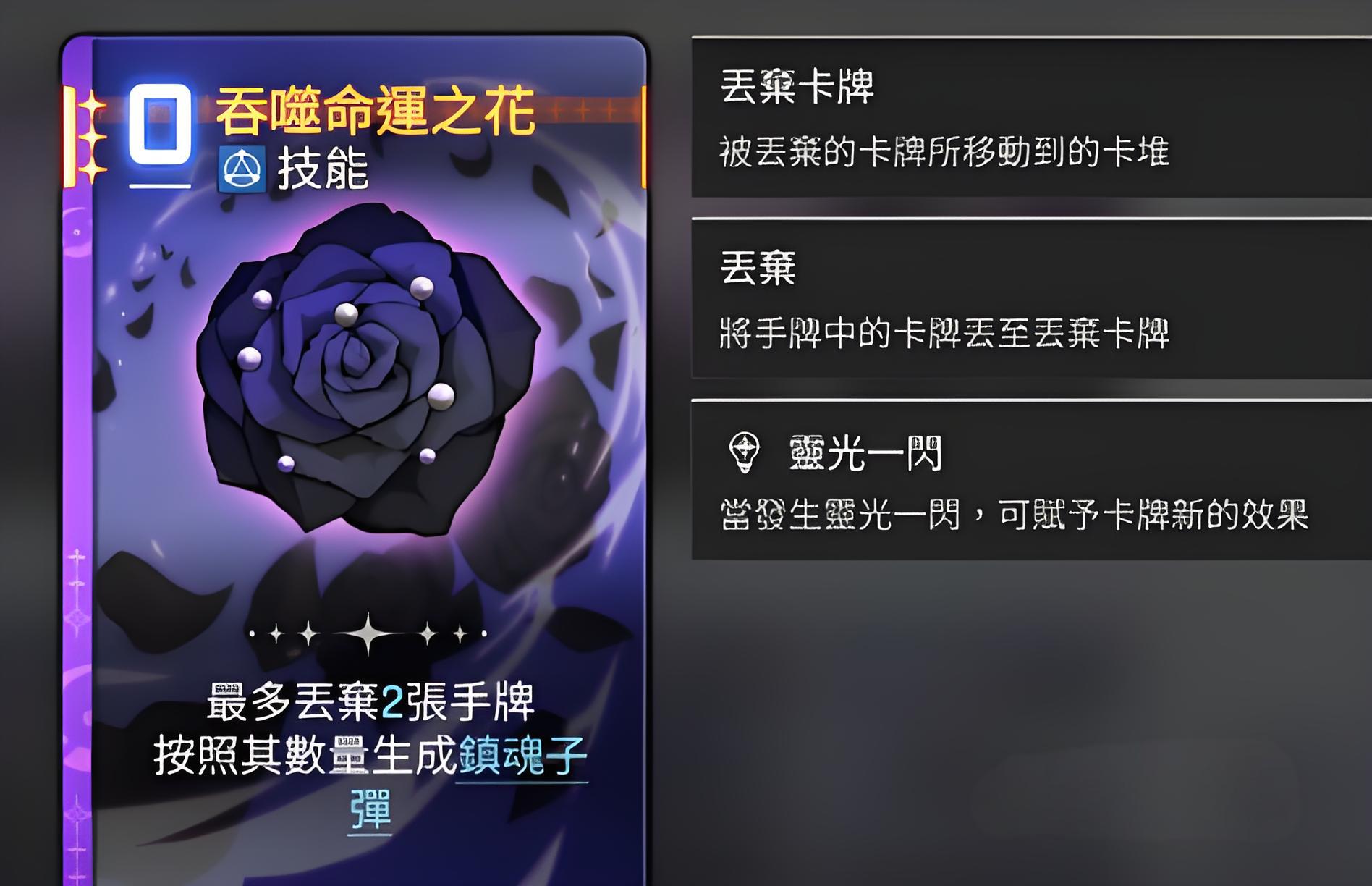 3、吞噬命運之花能丟棄最多2張手牌換鎮魂子彈,靈光一閃狀態提升傷害至250%,第四張子彈轉技能卡第五張進入強化階段。
