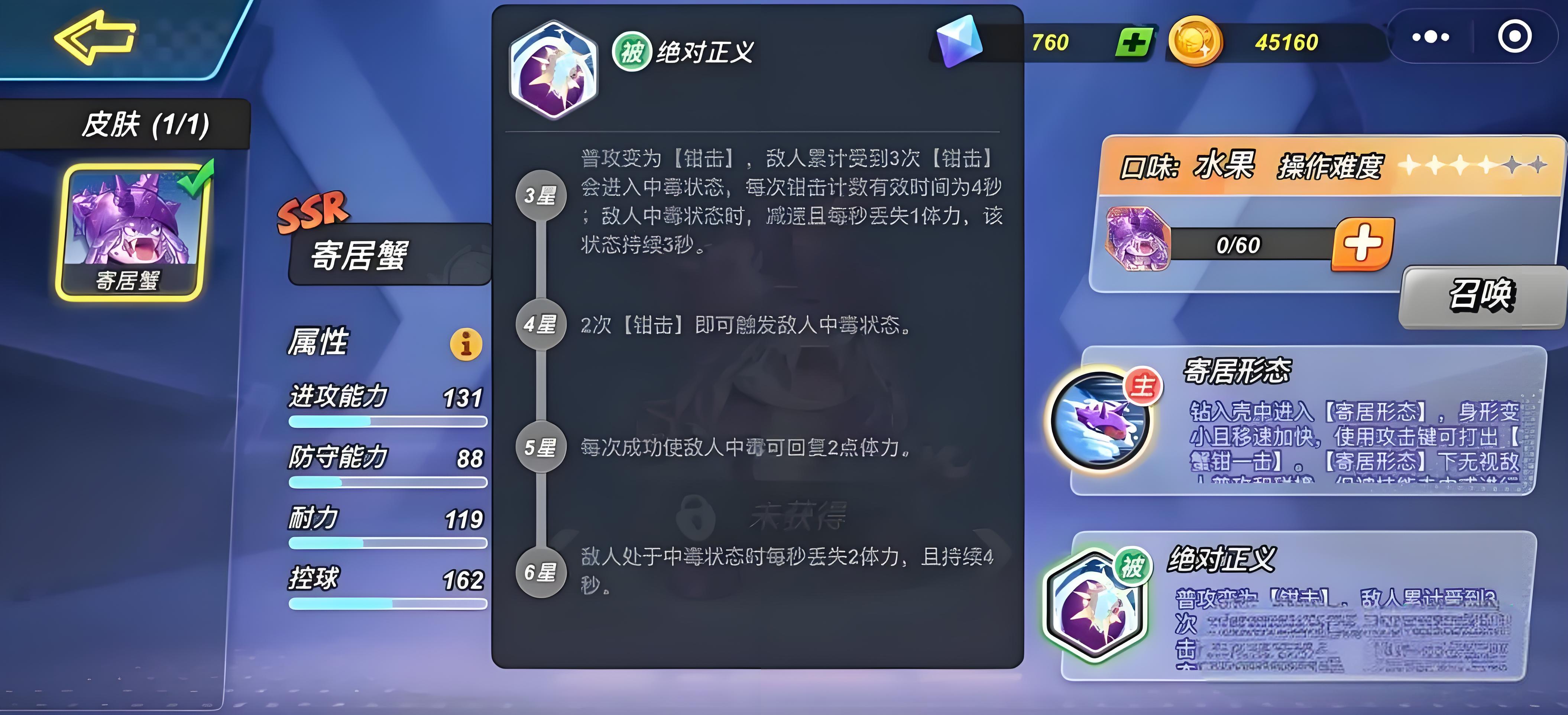 1、核心主動技能寄居形態開啟后身形縮小移速大增,可無視敵方普攻和碰撞僅會被技能命中貼近對手能夾擊搶球攻擊鍵可釋放蟹鉗一擊。