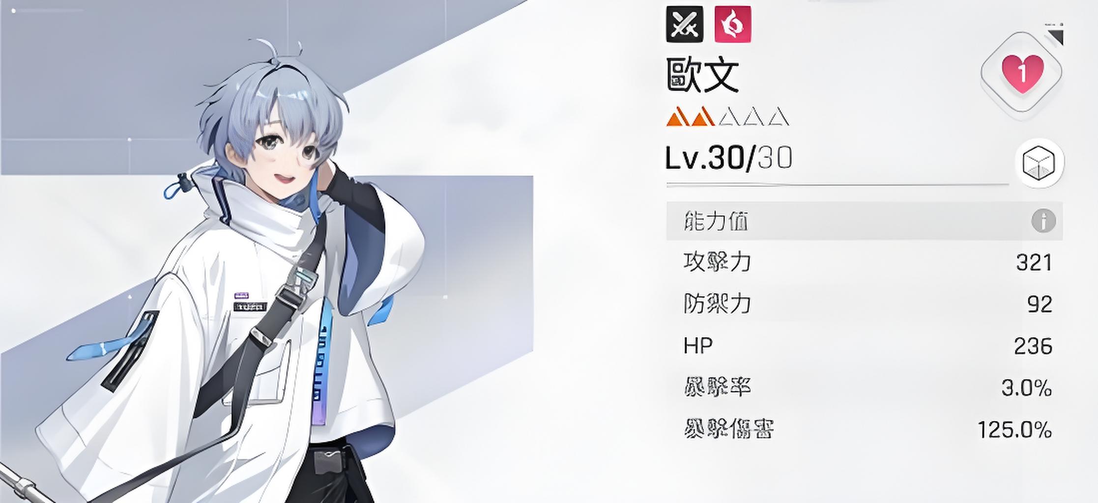 1、定位近戰爆發型角色,滿級攻擊力321防御92HP236,暴擊率3%暴擊傷害125%,屬性側重輸出適合主動切入敵方陣型。