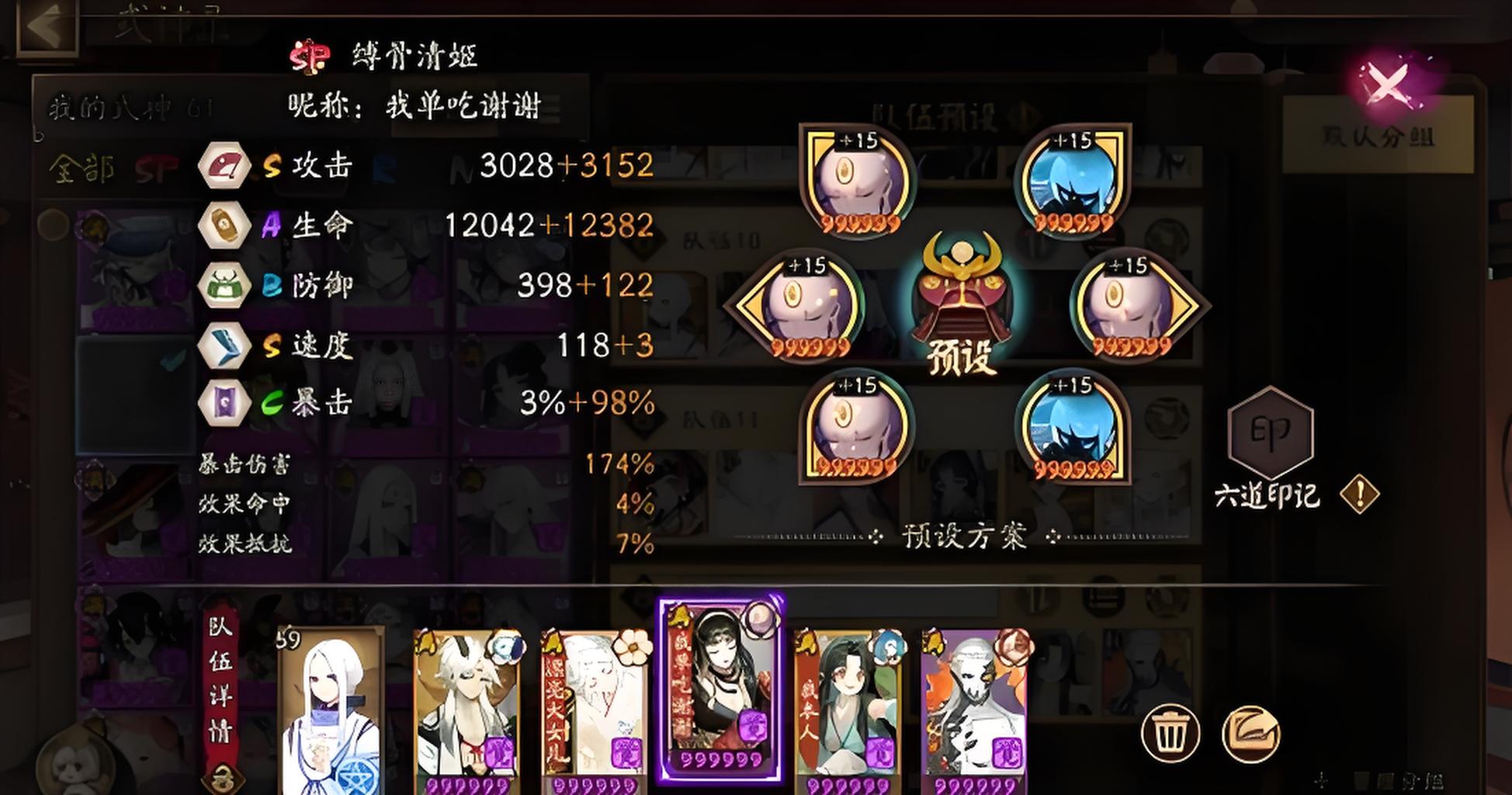 1、核心陣容選用一目連縛骨清姬久次良緣結神因幡輝夜姬,搭配晴明,依靠降攻護盾奶量組合,容錯率高適配各類配置情況。