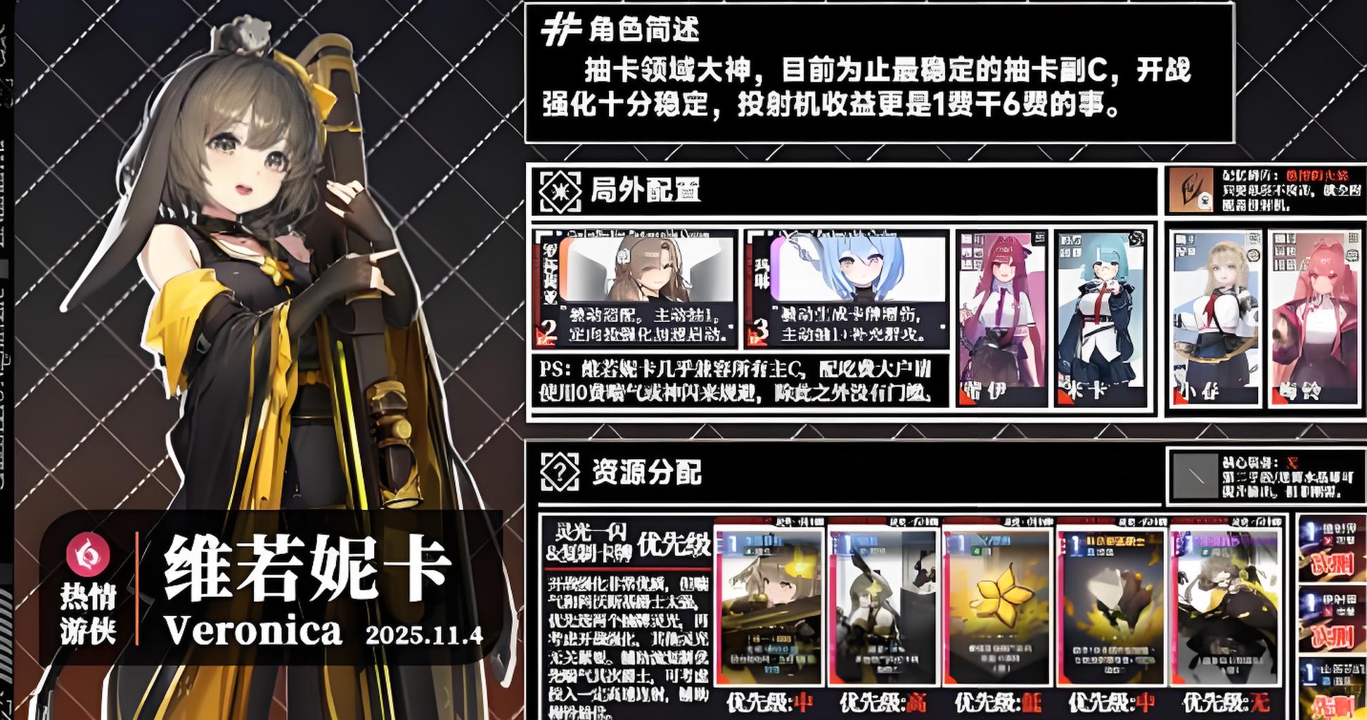 卡厄思夢境中的熱情游俠維若妮卡是泛用性和穩定性兼具的強力角色,定位抽卡副C可輔助過牌補充傷害,特定卡組搭配下還能轉型輸出核心,核心技能和卡牌機制特色鮮明,合理運用能大幅提升隊伍整體戰力,下面將從核心技能卡牌特性適配情況資源分配等方面展開詳細說明。