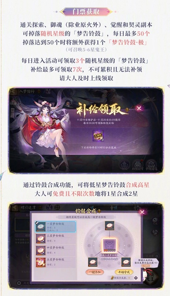 2、多元獲取門票夢告鈴鼓,通過副本掉落免費領取勾玉購買三種方式獲取,不同途徑有數量限制和特殊規則需提前知曉靈活安排。