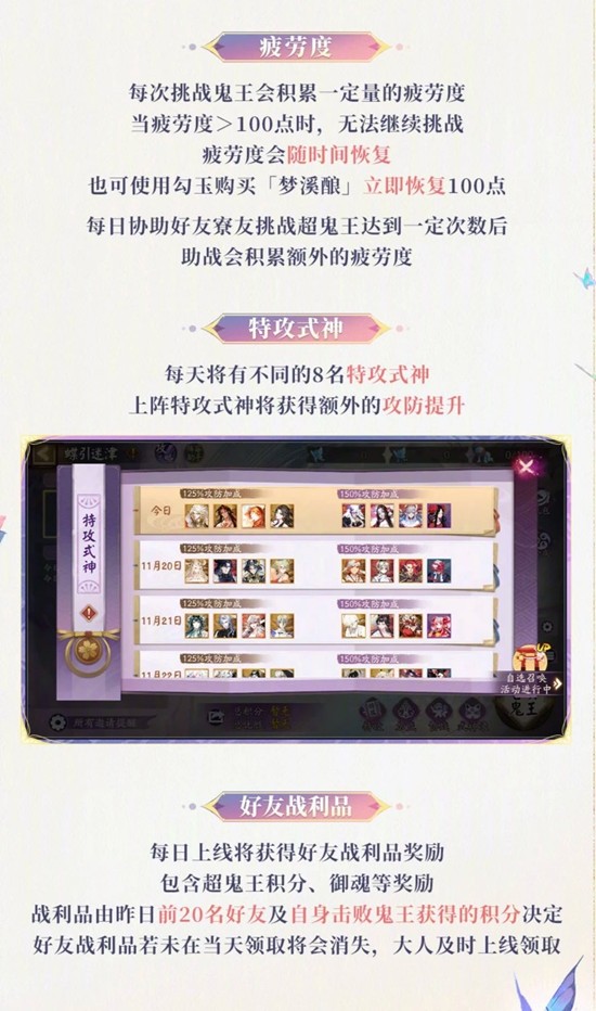 4、搭配強勢陣容提升戰力,通用陣容適合多星級鬼王,結合每日特攻式神特性,按配速要求和契靈選擇組建隊伍增強挑戰能力。