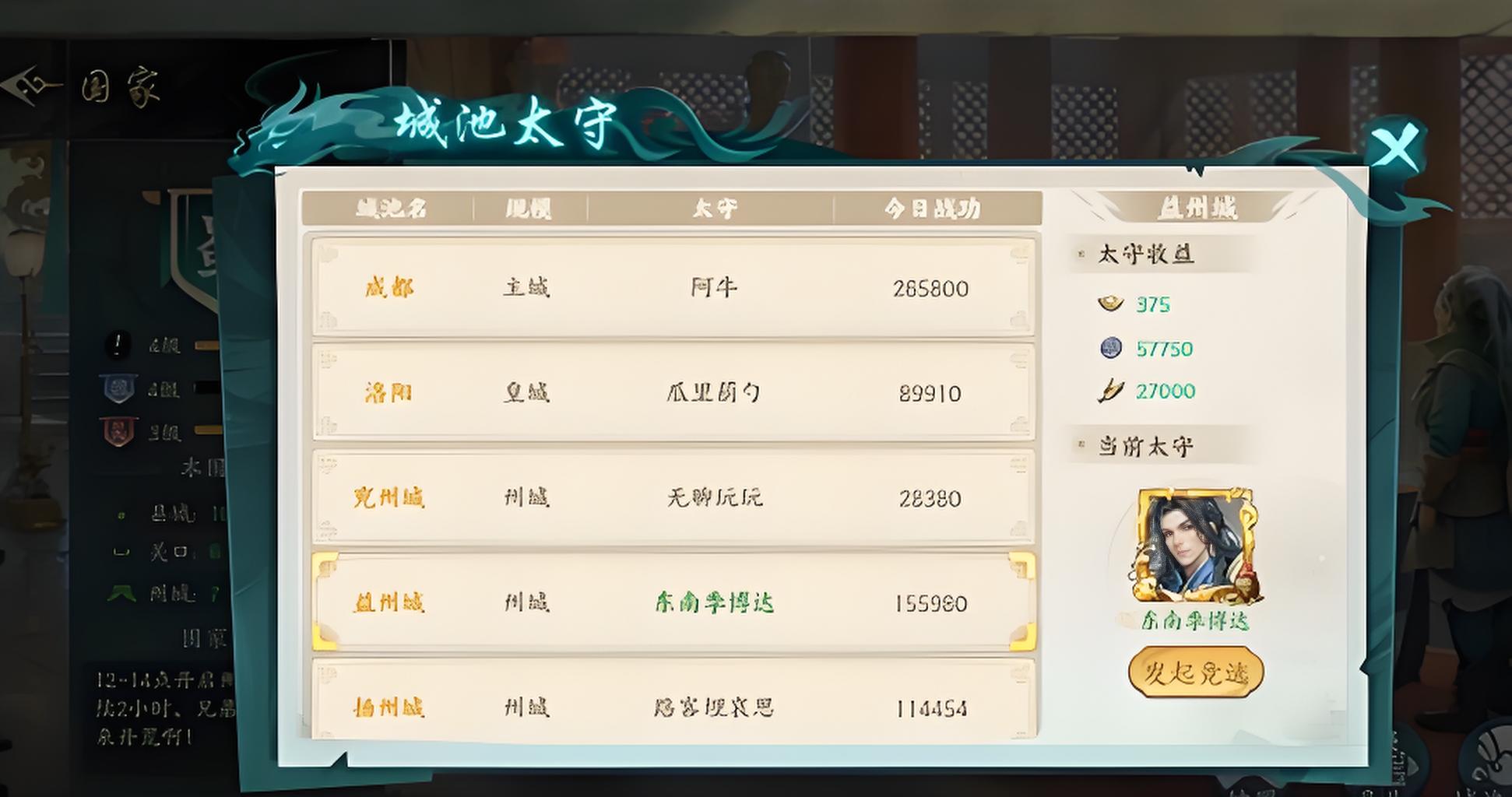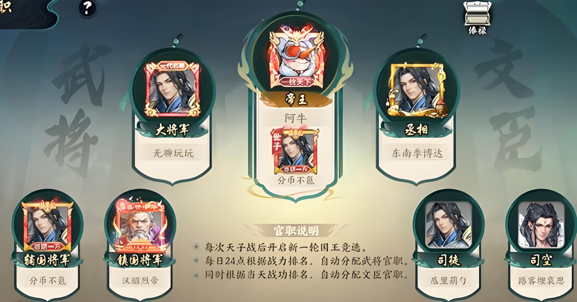 4、官職系統帶來額外機會,每日依戰功排名分配官職,12至14點開啟太守競選,成功當選可獲得包含秘籍在內的豐富獎勵。